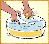 เขาใซ้มือของเขาสองข้างล้างถ้วย มือหนึ่งกะจับฟองน้ำ แล้วกะถูๆๆ ฮุอยู่ในถ้วยนั้น อีกมือหนึ่งกะจับถ้วย ไว้บ่ให้มันดิ้น หลือว่าบ่ให้มันหลุดมือไปใส แล้วเขากะล้างๆๆ เพื่อที่สิให้ถ้วยนี้มันสะอาด หลือว่าเกี้ยงนั้นหละ