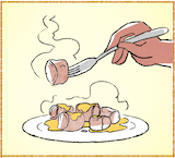 แนวกินอันนี้ฮ้อนบ่ ฮ้อนอยู่ เบิ่งแนวกินอยู่ในจานแล้วคือสิฮ้อนอยู่ หลือว่าอุ่นอยู่ เพาะว่ามันมีควนลอยขึ้นมา กะเลยฮู้ว่า แนวกินอันนี้มันฮ้อนอยู่ หลือว่าอุ่นอยู่