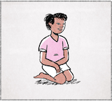 เขากำลังนั่งพับเพียบอยู่ เขาใส่สิ้นสีเหลียง เขาใส่เสี้ยแขนสั้นสีฟ้า