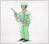 กะใส่เสี้ย เป็นเสี้ยแขนญาวพ้อม ใส่ส้งขาญาวพ้อม แล้วกะมีหมวกป้องกันโตพ้อม แล้วกะมือสองข้างหนะกะถือปืนไว้พ้อมเนาะ เพื่ออาทิสิเอาไว้ป้องกันโตหลือว่าญิงพุล้ายเนาะ