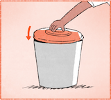 Basic vocabulary — Page 30 — Series B, pictures 14-17: bucket, trash, to put in, to smell, to close the lid