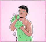 แล้วเขาเซ็ดโตเฮ็ดหญัง เขาอาดสิหัวกะอาบน้ำมาแล้ว หลือว่าหัวกะอาบน้ำแล้ว เขากะเลยสิเซ็ดโตให้มันแห้ง เพื่อที่ว่าสิบ่ให้โตเปียก หลือว่าบ่ให้หัวเปียก บ่ให้อี่หยังเปียก ให้บ่ให้อะวัยยะวะของเฮาเนี้ยเปียก เฮากะเลยต้องเซ็ดผ้า เออ เซ็ดโต เอาผ้าเซ็ดโตมาเซ็ด หลือว่าเอาผ้าขนหนูมาเซ็ดให้มันแห้งเนาะ