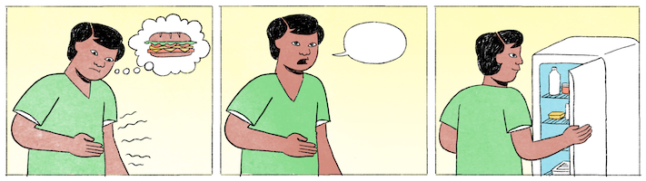 កូន៖ មានអីញ៉ាំតិចតួចសិនអត់ម៉ាក់? ហេវខ្លាំងអា៎។ កូរពោះគ្រូកៗម៉ង។