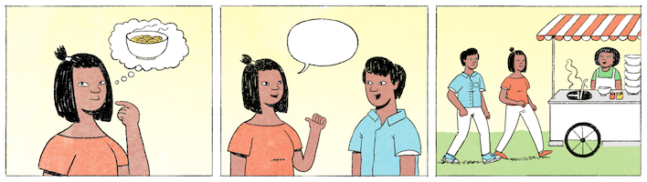 វិចិត្រ៖ ផារី តស់ទៅញ៉ាំអីសិន ខ្ញុំឃ្លានហើយ។ នៅមុខនោះមានហាងលក់ភីហ្សាមួយ។