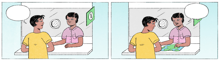 អ្នកទទួលភ្ញៀវ៖ បងអញ្ជើញដើរទៅត្រង់ ហើយបត់ស្ដាំបន្តិចទៅ ឃើញជណ្ដើរយន្តហើយ។