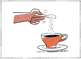 បន្ទាប់មកទៀតរូបភាពទីនៅក្នុងរូបភាពទីយើងឃើញ បន្ទាប់ពីគាត់ចាក់ទឹកក្រូចឲ្យកូនស្រីរបស់គាត់ហើយ បុរសម្នាក់នោះ គាត់ក៏បានយកស្ករសមកលាយជាមួយនឹងកាហ្វេរបស់គាត់ម្ដងអញ្ចឹងដោយសារតែកាហ្វេខ្មៅ គឺវាមានរសជាតិល្វីងខ្លាំង ព្រោះវាអត់មានទាន់លាយស្ករទេ អញ្ចឹងអ្នកដែលឆុងកាហ្វេ គាត់អត់ទាន់លាយស្ករឲ្យទេ ព្រោះគាត់អត់ដឹងថាអតិថិជនរបស់គាត់ត្រូវការរសជាតិអ្វីត្រូវការល្វីង ឬក៏ផ្អែម អញ្ចឹងគាត់ឆុងហើយគាត់អត់ដាក់ស្ករទេ គឺចាំឲ្យអតិថិជនរបស់គាត់លាយខ្លួនឯងអញ្ចឹងដោយសារតែអតិថិជនខ្លះ គឺគាត់ចូលចិត្តញ៉ាំកាហ្វេល្វីងខ្លាំង ដូច្នេះគាត់អត់លាយស្ករទេ គឺគាត់ឆុងហើយគាត់ញ៉ាំតែម្ដងចំណែកអ្នកខ្លះទៀតគឺគាត់ចូលចិត្តញ៉ាំកាហ្វេដែលល្វីងតិចឬក៏ល្វីងល្មម អញ្ចឹងគាត់អាចលាយស្ករបន្ថែមមួយស្លាបព្រា ឬក៏ពីរស្លាបព្រា រួចកូរឲ្យសព្វ ដើម្បីឲ្យស្កររលាយ ហើយញ៉ាំទៅមានរសជាតិឆ្ងាញ់តាមអ្វីដែលគាត់ត្រូវការចំណែកអ្នកខ្លះទៀត គាត់អត់ចូលចិត្តល្វីងខ្លាំង អញ្ចឹងគាត់អាចលាយនឹងទឹកដោះគោ ដែលយើងហៅថា កាហ្វេទឹកដោះគោអញ្ចឹងយើងអាចលាយបានច្រើន ជាក់ស្ដែងនៅក្នុងរូបភាពទីដោយសារតែបុរសម្នាក់នោះ គាត់អត់សូវចូលចិត្តល្វីង ដូច្នេះគាត់ក៏បានយកស្ករសមួយស្លាបព្រា មកចាក់ចូលទៅក្នុងកែវកាហ្វេរបស់គាត់ ឬក៏ចាក់ចូលទៅក្នុងពែងកាហ្វេ យើងហៅថាពែងកាហ្វេអញ្ចឹងគាត់យកស្ករសចាក់ចូល ដោយសារតែគាត់អត់សូវចូលចិត្តល្វីង ដូច្នេះគាត់ត្រូវការផ្អែមតិចអញ្ចឹងគាត់លាយស្ករសដើម្បីឲ្យមានរសជាតិផ្អែមនៅក្នុងរូបភាពទីនេះ
