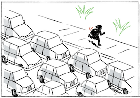 បន្ទាប់មកទៀតរូបភាពទីនៅក្នុងរូបភាពទីយើងឃើញថា នារីម្នាក់នោះ គាត់ប្រហែលជារស់នៅក្នុងទីក្រុង ព្រោះថាយើងឃើញមានឡានជាច្រើននៅតាមផ្លូវ កំពុងតែបើកបរនៅតាមផ្លូវ ក៏ប៉ុន្តែឡានទាំងអស់នោះគឺមិនបានទៅលឿននោះទេ គឺទៅមុខអត់លឿននោះទេ ដោយសារតែវាស្ទះផ្លូវយ៉ាងខ្លាំងអញ្ចឹងនៅលើចំហៀងផ្លូវម្ខាង នៅលើចំហៀងផ្លូវម្ខាង យើងឃើញស្រមោលរបស់នារីម្នាក់នោះ ដោយសារតែយើងមើលពីចម្ងាយ ដូច្នេះយើងឃើញរូបនារីម្នាក់នោះគឺមានពណ៌ខ្មៅ អញ្ចឹងយើងឃើញគាត់កំពុងតែស្ពាយកាបូប ហើយរត់បណ្ដើរ អញ្ចឹងដៃគាត់ម្ខាងគាត់កាន់កាបូបស្ពាយនៅនឹងស្មា ហើយគាត់កំពុងតែរត់បណ្ដើរដោយអាការៈប្រញាប់ ព្រោះថាគាត់ជិះឡានអត់កើតទេ ឬក៏គាត់ជិះរថយន្ត ឬក៏គាត់ជិះតាក់ស៊ីអត់បាន ព្រោះថាស្ទះផ្លូវខ្លាំងពេក អញ្ចឹងឡានទៅមុខអត់រួចនោះទេ អញ្ចឹងដើម្បីឲ្យទាន់ម៉ោង ព្រោះគាត់កំពុងតែប្រញាប់ ដូច្នេះគាត់ត្រូវតែរត់ឲ្យលឿនទៅមុខ ប្រសិនបើគាត់ចាំឡាន គឺវាអាចយូរ អញ្ចឹងវាអាចយូរ អញ្ចឹងអាចធ្វើឲ្យគាត់ខកម៉ោងបាន គាត់អត់អាចណាត់ជួបគេបានទាន់ពេល អញ្ចឹងគាត់ត្រូវតែរត់នៅលើផ្លូវវិញ គាត់អត់ជិះឡាន ឬក៏អត់ជិះតាក់ស៊ីនោះទេ