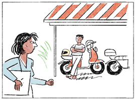 បន្ទាប់មកទៀតរូបភាពទីនៅក្នុងរូបភាពទីបន្ទាប់ពីនារីម្នាក់នោះ គាត់រត់បានមួយសន្ទុះក្រោយមក គាត់ក៏មកដល់រោងមួយ អញ្ចឹងគាត់ឈរនៅខាងមុខរោងមួយ ដោយគាត់ ដៃខាងស្ដាំរបស់គាត់ គាត់ស្ពាយកាបូប ហើយដៃខាងស្ដាំរបស់គាត់ គឺទប់កាបូបគាត់យ៉ាងជាប់ ដោយគាត់កំពុងតែឈរទៅក្នុងសម្លឹងរោងមួយ ដែលនៅក្នុងរោងនោះ យើងឃើញមានដំបូល ប៉ុន្តែអត់មានជញ្ជាំងនោះទេ អញ្ចឹងរោងនោះគឺជារោងម៉ូតូឌុប ដោយយើងឃើញមានម៉ូតូចំនួនពីរគ្រឿងនៅខាងក្រោមរោងនោះ ហើយមានបុរសម្នាក់ ដែលជាម្ចាស់ម៉ូតូ កំពុងតែឈរផ្អែកម៉ូតូរបស់គាត់ អញ្ចឹងបុរសម្នាក់នោះគាត់ពាក់អាវដៃខ្លី ខោជើងវែងពណ៌ ហើយគាត់ ម៉ូតូរបស់គាត់គឺមានពណ៌ទឹកក្រូចអញ្ចឹងម៉ូតូរបស់គាត់គឺមានកង់ពីរ ហើយមានមួកការពារនៅលើនោះផងដែរ អញ្ចឹងគាត់គឺជាអ្នករត់ម៉ូតូឌុប ដោយនារីម្នាក់នោះគាត់មានអាការៈប្រញាប់ ដោយសារតែស្ទះផ្លូវ ជិះឡានអត់កើត អញ្ចឹងគាត់រត់ នៅពេលដែលគាត់រត់បានមួយភ្លែតមក គឺគាត់បានមកដល់កន្លែងម៉ូតូឌុបមួយដែលមានរោង មានដំបូលពណ៌ផ្កាឈូក ហើយមានបុរសម្នាក់ គាត់កំពុងតែឈរផ្អែកម៉ូតូដើម្បីរង់ចាំម៉ូយ ឬក៏រង់ចាំអតិថិជនរបស់គាត់អញ្ចឹងនារីម្នាក់នោះ គាត់ក៏បានឈប់នៅត្រង់រោងនោះ ហើយសម្លឹងទៅមើលម៉ូតូឌុប ដែលមានបុរសម្នាក់នោះកំពុងតែឈរផងដែរ