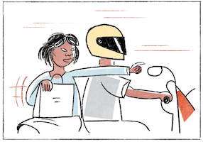 បន្ទាប់មកទៀតរូបភាពទីនៅក្នុងរូបភាពទីយើងឃើញ នៅពេលដែលគាត់ជិះជ្រែឡានបានបន្តិចក្រោយមក នារីម្នាក់នោះ គាត់ក៏បានចង្អុល ប្រាប់ទៅបុរសម្នាក់នោះថា គោលដៅរបស់គាត់គឺនៅខាងមុខ ដូច្នេះគាត់ចង់ឲ្យបុរសម្នាក់នោះអែបទៅឆ្វេង ឬក៏អែបទៅស្ដាំ ដើម្បីឲ្យគាត់ចុះអញ្ចឹងយើងឃើញនៅក្នុងរូបភាពនេះ បុរសដែលជាម៉ូតូឌុបនោះ គាត់បានកំពុងតែអង្គុយ កាន់ចង្កូតម៉ូតូ ហើយបញ្ជាម៉ូតូរបស់គាត់ទៅមុខយ៉ាងលឿន ចំណែកឯនារីម្នាក់នោះ គាត់ក៏បានលើកដៃឆ្វេងគាត់ឡើង អញ្ចឹងគាត់លើកដៃឆ្វេងរបស់គាត់ឡើង ហើយចង្អុលទៅខាងមុខ ដោយចង្អុលប្រាប់ទៅម្ចាស់ម៉ូតូ ដើម្បីប្រាប់ថា គាត់មកដល់គោលដៅហើយ ដូច្នេះឲ្យម្ចាស់ម៉ូតូគាត់រកកន្លែងឈប់ ដើម្បីឲ្យនារីម្នាក់នោះគាត់ចុះ ព្រោះគាត់បានមកដល់គោលដៅ ដោយយើងឃើញនៅក្នុងរូបភាពនេះ គឺនារីម្នាក់នោះ គាត់បានលើកដៃឆ្វេងចង្អុលទៅខាងមុខ ចំណែកដៃស្ដាំរបស់គាត់ គឺគាត់នៅតែកាន់កាបូបរបស់គាត់ដែលនៅលើភ្លៅយ៉ាងជាប់ ព្រោះគាត់ខ្លាចជ្រុះកាបូប ដោយសារតែកាបូបរបស់គាត់ជាកាបូបធំ អញ្ចឹងគាត់អត់បានស្ពាយនៅលើស្មាទេ នៅពេលដែលគាត់ជិះម៉ូតូ ដូច្នេះគាត់ត្រូវដាក់លើភ្លៅ ហើយដៃរបស់គាត់ត្រូវតែកាន់កាបូបនោះឲ្យជាប់ ប្រសិនបើកាន់អត់ជាប់ទេ កាបូបនោះអាចនឹងរអិលធ្លាក់ ដូច្នេះទ្រព្យសម្បត្តិរបស់គាត់ មានដូចជាលុយ មានដូចជាទូរស័ព្ទផ្សេងគឺអាចនឹងបាត់បង់ នៅពេលដែលកាបូបនោះជ្រុះពីលើខ្លួនរបស់គាត់ ឬក៏ជ្រុះពីលើម៉ូតូ