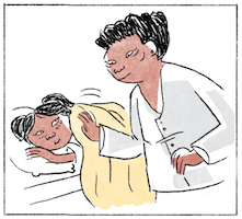 បន្ទាប់មកទៀតរូបភាពទីរូបភាពទីបន្ទាប់ពីស្ត្រីចំណាស់ម្នាក់នោះគាត់បានរៀបចំចង្ហាន់ ឬក៏រៀបចំបាយរួចរាល់ហើយ គាត់ក៏បានចូលមកដាស់ចៅស្រីរបស់គាត់ អញ្ចឹងគាត់ចូលមកដាស់ក្មេងស្រីម្នាក់ដែលកំពុងគេង ដែលក្មេងស្រីម្នាក់នោះ យើង មើលទៅអាយុគាត់ប្រហែលជាឆ្នាំ អញ្ចឹងគាត់កំពុងតែគេងនៅក្នុងបន្ទប់គេងរបស់គាត់ អញ្ចឹងស្ត្រីចំណាស់ម្នាក់នោះគាត់បានមកដាស់ចៅស្រីរបស់គាត់ដើម្បីឲ្យក្រោកជាទូទៅមនុស្សចាស់គាត់គេងលឿន បានន័យថាគាត់គេងឆាប់ភ្ញាក់គាត់សម្រាន្ត យើង មនុស្សចាស់យើងប្រើពាក្យថាសម្រាន្ត ចំណែកឯក្មេងយើងហៅថាគេង ឬក៏ដេក អញ្ចឹងមនុស្សចាស់គាត់គេង គាត់សម្រាន្តគឺគាត់ភ្ញាក់លឿន ហើយគាត់ភ្ញាក់នៅពេលព្រឹកព្រលឹម ប៉ុន្តែក្មេងគឺគាត់អត់ចូលចិត្តភ្ញាក់លឿនទេ អញ្ចឹងគាត់គេងរហូតទាល់តែពេលព្រឹក រហូតទាល់តែដល់យាយគាត់ដាស់អញ្ចឹងយើងឃើញ[...]ក្មេងស្រីម្នាក់នោះ គាត់កំពុងតែគេង ដែលក្បាលរបស់គាត់កើយនៅលើខ្នើយ ហើយគាត់ដណ្ដប់ភួយមួយ ដោយភួយនោះគឺពណ៌លឿង អញ្ចឹងពេលនោះគឺជាពេលព្រឹកហើយ ដូច្នេះស្ត្រីចំណាស់ម្នាក់នោះ គាត់បានទៅដាស់នាងឲ្យភ្ញាក់ឡើង អញ្ចឹងក្មេងស្រីតូចនោះគឺគាត់អត់ចង់ភ្ញាក់ទេ ដោយសារតែគាត់ចូលចិត្តគេង ក្មេងគឺចូលចិត្តគេង ហើយគេចូលចិត្តឲ្យគេងឲ្យបានយូរ គឺគេអត់ចង់ក្រោកទេនៅពេលដែលគេគេង អញ្ចឹងស្ត្រីចំណាស់ម្នាក់នោះដាស់ចៅស្រីរបស់គាត់ ដើម្បីឲ្យនាងក្រោកពីគេង ដើម្បីរៀបចំខ្លួន