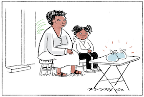 បន្ទាប់មកទៀតរូបភាពទីនៅក្នុងរូបភាពទីបន្ទាប់ពីស្ត្រីចំណាស់ម្នាក់នោះ គាត់បានដាស់ចៅស្រីគាត់ក្រោកហើយ អញ្ចឹងគាត់បាននាំចៅស្រីរបស់គាត់មកខាងក្រៅផ្ទះ ដើម្បីអង្គុយរង់ចាំព្រះសង្ឃដែលយើងឃើញនៅក្នុងរូបភាពទីនេះ គឺពួកគេទាំងពីរនាក់ គឺកំពុងតែអង្គុយនៅលើកៅអីម្នាក់មួយ ដោយស្ត្រីចំណាស់ដែលជាយាយ អញ្ចឹងចំពោះមនុស្សចាស់ហៅទៅកូនក្មេងយើងហៅថាចៅ រីឯចៅត្រូវហៅមកមនុស្សចាស់វិញថាយាយ អញ្ចឹងពួកគេទាំងពីរនាក់គឺជាយាយនិងចៅ ដោយស្ត្រីចំណាស់ជាយាយ និងក្មេងស្រីតូចម្នាក់នោះគឺជាចៅដោយយើងឃើញពួកគេទាំងពីរនាក់កំពុងតែអង្គុយនៅលើកៅអីនៅខាងមុខផ្ទះ ដោយស្ត្រីចំណាស់គាត់អង្គុយលើកៅអី គាត់ដាក់ដៃរបស់គាត់ទាំងពីរនៅលើជង្គង់ អញ្ចឹងគាត់អង្គុយរង់ចាំដោយដាក់ដៃទាំងពីរនៅលើជង្គង់ រីឯក្មេងស្រីម្នាក់នោះគាត់ចងសក់ទីទុយ យើងឃើញសក់គាត់ចងទីទុយ ហើយគាត់ពាក់អាវដៃវែងពណ៌ និងស្លៀកខោជើងវែងពណ៌ខ្មៅ ពាក់ស្បែកជើងប៉ាតា អញ្ចឹងពួកគេទាំងពីរនាក់កំពុងតែអង្គុយរង់ចាំដើម្បីដាក់បាត្រព្រះសង្ឃ ហើយនៅខាងមុខរបស់ពួកគេទាំងពីរនាក់គឺមានតុចំនួនមួយ អញ្ចឹងគឺមានតុមួយ ហើយដែលតុនោះ នៅលើតុគឺមានចង្ហាន់ឬក៏ម្ហូបអាហារចំនួនពីរកញ្ចប់ អញ្ចឹងម្ហូបអាហារចំនួនពីរកញ្ចប់នេះ គឺជាម្ហូបអាហារដែលស្ត្រីចំណាស់ម្នាក់នោះគាត់បានរៀបចំ ដើម្បីដាក់បាត្រដល់ព្រះសង្ឃ ឬក៏ដើម្បីរាប់បាត្រដល់ព្រះសង្ឃ