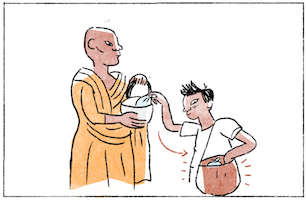 បន្ទាប់មកទៀតរូបភាពទី ១៥ រូបភាពទី ១៥ គឺយើងឃើញថា បន្ទាប់ពីព្រះសង្ឃបានសូត្រធម៌ឲ្យពរដល់ស្ត្រីចំណាស់និងចៅស្រីរបស់គាត់ហើយ អញ្ចឹងយើងឃើញព្រះសង្ឃក៏បានបែរមករកកូនសិស្សរបស់គាត់ ឬក៏កូនសិស្សលោកដែលឈរនៅខាងក្រោយ អញ្ចឹងកូនសិស្សលោកគាត់ឈរនៅខាងក្រោយព្រះសង្ឃជានិច្ចអញ្ចឹងបន្ទាប់ពីព្រះសង្ឃបានសូត្រធម៌រួចរាល់ហើយ គាត់ក៏បានបែរមករកកូនសិស្សរបស់គាត់វិញ អញ្ចឹងគាត់ គាត់បានបែរមករកកូនសិស្សលោក ហើយបើកគម្របបាត្រឡើង ដើម្បីឲ្យកូនសិស្សលោកដកចង្ហាន់ចេញពីបាត្រយកមកដាក់ក្នុងថង់យាមអញ្ចឹងដោយសារតែបាត្រនោះតូច បាត្រតូច ដូច្នេះអត់អាចដាក់ចង្ហាន់បានច្រើននោះទេ អញ្ចឹងរាល់ពេលដែលព្រះសង្ឃបានទទួលចង្ហាន់ពី[…] ពីស្ត្រីចំណាស់ម្នាក់នោះ ឬក៏ពីប្រជាជនរួចរាល់ហើយ ព្រះសង្ឃតែងតែយកចង្ហាន់នោះមកឲ្យកូនសិស្ស ដើម្បីយកចេញពីបាត្រដាក់ទៅក្នុងថង់យាមវិញ ដោយសារតែបាត្រតូចអត់អាចដាក់ចង្ហាន់បានច្រើនទេ ព្រោះវាពេញ ហើយអាចហៀរ និងធ្លាក់ចុះបាន ដូច្នេះគេត្រូវផ្ទេរចង្ហាន់ដាក់ចូលទៅក្នុងថង់យាម ដែលថង់យាមគឺជាកាបូបមួយរបស់ព្រះសង្ឃ គឺជាកាបូបធំមួយ បានន័យថាកាបូបធ្វើអំពីក្រណាត់ ហើយវាធំមួយដែលមានដៃយួរសម្រាប់ស្ពាយ អញ្ចឹងកាបូបនោះគឺធំ ដូច្នេះអាចដាក់ចង្ហាន់បានច្រើនអញ្ចឹងបន្ទាប់ពីព្រះសង្ឃគាត់ទទួលបានចង្ហាន់ពីប្រជាជន គាត់តែងតែយកចង្ហាន់ទាំងនោះមកឲ្យកូនសិស្ស ដើម្បីដាក់ទៅក្នុងថង់យាមអញ្ចឹងកូនសិស្សគាត់ស្ពាយថង់យាមដើរតាមពីក្រោយព្រះសង្ឃជានិច្ច ដែលនៅក្នុងថង់យាមនោះ គឺជាចង្ហាន់របស់ព្រះសង្ឃ