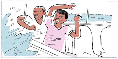 បន្ទាប់មកទៀតរូបភាពទី ១០ នៅក្នុងរូបភាពទី ១០ យើងឃើញថា ជាទូទៅការជិះទូក គឺមិនមែនជិះតែឯងនោះទេ បានន័យថាមានទូកផ្សេងទៀត ក៏មានការបើកបរនៅលើផ្លូវទឹកនោះដែរ អញ្ចឹងការធ្វើដំណើរតាមផ្លូវទឹក មានដូចជាទូកកាណូត មានដូចជាកប៉ាល់ធំជាច្រើន អញ្ចឹងប្រសិនបើកប៉ាល់ពីរជិះទន្ទឹមគ្នា អាចនឹងសាចទឹកដាក់គ្នា ដែលជាក់ស្ដែងនៅក្នុងរូបភាពទី ១០ នេះ ប្រហែលជាមានកប៉ាល់ធំណាមួយ ឬក៏ប្រហែលជាមានកប៉ាល់លឿនណាមួយ ជិះមកក្បែរទូករបស់គាត់ ដូច្នេះហើយធ្វើឲ្យមានសាចទឹកពីក្នុងទន្លេចូលទៅក្នុងទូក អញ្ចឹងប្រសិនបើយើងជិះនៅក្នុងទូកដែលអត់មានជញ្ជាំង ហើយយើងអង្គុយខាងគេ នៅពេលដែលមានទឹករលកសាចចូល គឺអាចធ្វើឲ្យយើងសើមក្នុងខ្លួនបាន គឺអាចធ្វើឲ្យយើងសើមបាន ដូច្នេះយើងត្រូវតែប្រុងប្រយ័ត្ន នៅពេលដែលអង្គុយនៅលើទូក ព្រោះថាពេលខ្លះ នៅពេលដែលមានទូកណាលឿន ឬក៏មានទូកធំជាងទូកដែលយើងអង្គុយ ជិះនៅក្បែរយើង គឺនឹងខ្ទាតទឹករលកចូលទៅក្នុងទូក ដែលធ្វើឲ្យយើងសើមបាន សើមសម្លៀកបំពាក់ ដែលជាក់ស្ដែងនៅក្នុងរូបភាពទី ១០ នេះ យើងឃើញថា មានទឹករលកមួយយ៉ាងធំ បានជះចូលទៅក្នុង បានសាចចូលទៅក្នុងទូក ដែលធ្វើឲ្យសើមទៅដល់បុរស ដែលពាក់អាវពណ៌ស្វាយដៃខ្លី និងបុរសចំណាស់ម្នាក់ ដែលពាក់អាវពណ៌នោះ គឺគាត់សើមទាំងពីរនាក់តែម្ដង ដោយសារតែរលកទឹកធំពេក ដោយសារតែមានទូកធំ ជិះមកក្បែរ ដូច្នេះហើយធ្វើឲ្យមានទឹកសាចចូលទៅក្នុងទូករបស់គាត់ដែលកំពុងអង្គុយ