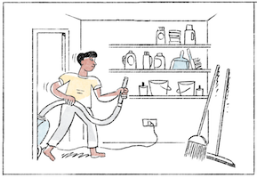 បន្ទាប់មកទៀតរូបភាពទី ១៣ រូបភាពទី ១៣ បន្ទាប់ពីគាត់ប្រើប្រាស់ម៉ាស៊ីនបូមធូលីនោះរួចរាល់ហើយ អញ្ចឹងបានន័យថាគាត់ប្រាកដថាគាត់បានសម្អាតនៅក្នុងផ្ទះបាយរបស់គាត់បានស្អាតហើយ បន្ទាប់ពីគាត់ធ្វើឲ្យបែកចានអម្បាញ់មិញ ហើយគាត់យកម៉ាស៊ីនបូមធូលីទៅបូមអំបែងចានឲ្យអស់ចេញពីកម្រាលឥដ្ឋ បន្ទាប់ពីគាត់សម្អាតរួចរាល់ហើយ គាត់ក៏បានចាប់បំពង់ម៉ាស៊ីនបូមធូលីដោយដៃទាំងពីររបស់គាត់ ហើយគាត់បានអូសម៉ាស៊ីនបូមធូលីនោះយកមកទុកនៅកន្លែងដើមវិញអញ្ចឹងនៅពេលដែលគាត់ប្រើប្រាស់ម៉ាស៊ីនបូមធូលី គឺគាត់អត់ចាំបាច់លើកម៉ាស៊ីននោះឡើងលើទេ អញ្ចឹងគាត់អត់ចាំបាច់លើក ឬក៏យួរម៉ាស៊ីនបូមធូលីនោះទេ ដោយសារតែម៉ាស៊ីនបូមធូលីគឺធ្ងន់ អញ្ចឹងគឺវាមានកង់សម្រាប់រុញ ដូច្នេះដើម្បីប្រើប្រាស់វា គឺយើងគ្រាន់តែរុញ ឬក៏អូសវា គឺវាអាចទៅមុខបានយ៉ាងស្រួលដោយសារវាមានកង់ អញ្ចឹងយើងអត់ចាំបាច់លើកវានោះទេ ដែលជាក់ស្ដែងនៅក្នុងរូបភាពទី ១៣ គឺបុរសម្នាក់នោះ គាត់កំពុងតែអូសម៉ាស៊ីនបូមធូលី គាត់កំពុងតែអូសម៉ាស៊ីនបូមធូលីចូលមកក្នុងផ្ទះ ឬក៏ចូលមកក្នុងបន្ទប់ដាក់សម្ភារៈរបស់គាត់វិញ ដោយគាត់ដាក់ម៉ាស៊ីនបូមធូលីទៅកាន់កន្លែងដើមរបស់វា អញ្ចឹងបុរសម្នាក់នេះ គឺជាមនុស្សដែលមានសណ្ដាប់ធ្នាប់ ដូច្នេះគាត់ប្រើប្រាស់របស់ នៅពេលដែលគាត់ប្រើប្រាស់របស់រួចហើយ គាត់តែងតែដាក់របស់នោះចូលទៅក្នុងកន្លែងដើមវាវិញ ដើម្បីកុំឲ្យពិបាករកនៅពេលដែលគាត់ចង់ប្រើប្រាស់ពេលក្រោយទៀត