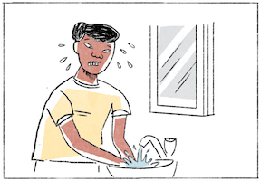 ចូលមកដល់រូបភាពទីនៅក្នុងរូបភាពទីយើងឃើញថា បន្ទាប់ពីបុរសនោះបានចូលមកដល់បន្ទប់ទឹកហើយ គាត់បានរត់សំដៅមករកឡាបូលាងដៃ អញ្ចឹងគាត់រត់មករកឡាបូលាងដៃ ដោយនៅក្នុងឡាបូលាងដៃនេះ យើងឃើញថានៅខាងលើឡាបូ គឺមានក្បាលរ៉ូប៊ីនេទឹកមួយ គាត់បានបើករ៉ូប៊ីនេទឹកនោះ ដើម្បីឲ្យទឹកហូរចេញមក បាទ គាត់បើកទឹកដើម្បីឲ្យទឹកហូរចេញ ហើយគាត់ដាក់ដៃទៅក្រោមទឹកនោះដើម្បីលាងសម្អាតដៃ អញ្ចឹងនៅពេលដែលយើងមានរបួស ហើយធ្វើឲ្យមានការហូរឈាម ឬក៏ដាច់រលាត់ស្បែកផ្សេងយើងត្រូវធ្វើការលាងសម្អាតមុខរបួសនោះឲ្យបានស្អាត ប្រសិនបើយើងមិនលាងសម្អាតនោះទេ មេរោគនឹងអាចជ្រាបចូលក្នុងខ្លួនរបស់យើងតាមរយៈមុខរបួសនោះជាក់ជាមិនខាន ដូច្នេះបុរសនោះ គាត់ត្រូវលាងដៃរបស់គាត់ដែលមានមុខរបួសឲ្យបានស្អាតជាមុនសិន មុននឹងធ្វើការព្យាបាល ធ្វើ[យ៉ាង]នេះគឺមេរោគមិនអាចចូលមកក្នុងខ្លួនតាមរយៈមុខរបួសបានទេ អញ្ចឹងនៅក្នុងរូបភាពនេះ គាត់លាងដៃរបស់គាត់ ដោយគាត់លាងឈាម ក៏ដូចជាមេរោគនៅក្បែរដៃរបស់គាត់ឲ្យបានស្អាតសិន