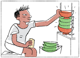 បន្ទាប់មកទៀតរូបភាពទី ១២ រូបភាពទី ១២ គឺ បន្ទាប់ពីក្មេងប្រុសនោះលាងចានបានស្អាតហើយ គាត់ក៏បានយកចានដែលលាងរួចរាល់នោះទៅគរទុកនៅលើរទេះ ដើម្បីឲ្យស្ត្រីអ្នកលក់យកចាននោះទៅប្រើប្រាស់បន្តទៀត អញ្ចឹងគាត់លាងម្ដងមួយពីចានប្រឡាក់ដែលនៅក្នុងធុង ដែលយើងឃើញក្បែររទេះលក់មីនោះ គឺយើងឃើញមានធុងមួយ សម្រាប់ដាក់ចានប្រឡាក់ ហើយនៅលើរទេះលក់មី គឺមានចានស្អាត ដែលក្មេងប្រុសនោះបានលាងរួចរាល់ហើយដាក់ទៅលើនោះ ដែលយើងឃើញមានចានពណ៌ក្រហម ពណ៌បៃតងជាដើម ដែលក្មេងប្រុសនោះទើបតែលាងរួចគឺចានពណ៌ក្រហម អញ្ចឹងគាត់ដាក់ចានពណ៌ក្រហមទៅលើគេ ដើម្បីឲ្យស្ត្រីម្នាក់នោះគាត់យកទៅប្រើប្រាស់ ចំណែកឯនៅក្បែរធុងរទេះគឺយើងឃើញមានកូនធុងមួយ ឬក៏កូនប៉ោតមួយ សម្រាប់ដាក់ចានប្រឡាក់ដែលនៅក្បែរនោះ អញ្ចឹងក្មេងប្រុសនោះ ក្រោយពីគាត់លាងចានក្រហមហើយ គាត់ត្រូវយកចានផ្សេងទៀតទៅលាងដូចគ្នា អញ្ចឹងគាត់ត្រូវលាងទាំងអស់ ចំពោះចានដែលប្រឡាក់ ឬក៏ចានឆ្នាំងដែលប្រឡាក់ គាត់ត្រូវលាងចេញទាំងអស់ អញ្ចឹងគាត់លាងម្ដងមួយដើម្បីសម្អាតចានដែលប្រឡាក់