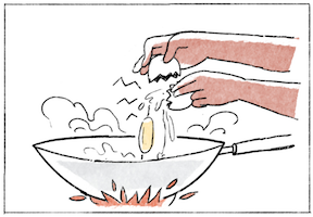បន្ទាប់មកទៀតរូបភាពទី ១០ នៅក្នុងរូបភាពទី ១០ ដោយសារតែនារីម្នាក់នោះ គាត់បានកុម្ម៉ង់បាយឆាលាយជាមួយនឹងពងទាចៀន សាច់ជ្រូក ដូច្នេះនៅពេលដែលគាត់ នៅពេលដែលអ្នកលក់គាត់បានឆាបាយជាមួយនឹងសាច់ជ្រូករួចរាល់ហើយ អញ្ចឹងគាត់នៅខ្វះមួយមុខទៀត គឺគាត់នៅខ្វះមួយមុខទៀត ដែលមួយមុខនោះ គឺជាពងទាចៀន ឬក៏ពងមាន់ចៀន ដូច្នេះដោយសារតែអ្នកទិញរបស់គាត់ ឬក៏អតិថិជនរបស់គាត់ កុម្ម៉ង់បាយឆាពងទាចៀនលាយសាច់ជ្រូក អញ្ចឹងអ្នកលក់ នៅពេលដែលគាត់ឆាបាយរួចរាល់ហើយ គាត់ចាក់បាយចូលទៅក្នុងចានសំប៉ែតមួយ បន្ទាប់មកគាត់យកខ្ទះនោះ ដើម្បីមកចៀនពងទាទៀត ដូច្នេះពងទាចៀន ពេលខ្លះតម្រូវតាមអតិថិជន ដោយសារតែអ្នកខ្លះចូលចិត្តញ៉ាំពងទាចៀនដែលឆ្អិនល្អ អញ្ចឹងគាត់អាចប្រាប់ទៅអ្នកលក់ថាឲ្យចៀនឲ្យឆ្អិន ចំណែកឯអ្នកខ្លះទៀត គាត់ចូលចិត្តញ៉ាំពងទាចៀន ដែលអត់សូវឆ្អិន បានន័យថាយើងហៅថាជ័រព្នៅ ពងទាចៀនជ័រព្នៅ ដូច្នេះអ្នកលក់គាត់ចៀនអត់សូវឆ្អិនទេ អញ្ចឹងទៅតាមចំណង់ចំណូលចិត្តរបស់អតិថិជន ដើម្បីកុម្ម៉ង់ទៅអ្នកលក់ថាតើយើងចង់ញ៉ាំពងទាដែលឆ្អិន ឬក៏មិនឆ្អិន អញ្ចឹងនៅក្នុងរូបភាពទី ១០ គឺគាត់កំពុងតែចៀនពងទា ដើម្បីដាក់ទៅលើបាយឆានោះបន្ថែមទៀត ដោយសារតែនារីម្នាក់នោះ គាត់បានកុម្ម៉ង់បាយឆាលាយនឹងពងទាចៀន