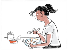 បន្ទាប់មកទៀតរូបភាពទី ១៣ រូបភាពទី ១៣ យើងឃើញថា បន្ទាប់ពីគាត់ទទួលបានបាយឆាហើយ នារីម្នាក់នោះ គាត់ក៏បានយកសមនិងស្លាបព្រាមកញ៉ាំបាយ បានន័យថានៅពេលដែលយើងញ៉ាំបាយ គឺយើងប្រើប្រាស់សមនិងស្លាបព្រាវែង ដោយនៅពេលដែលយើងញ៉ាំ បាយឆានោះ ពេលខ្លះគឺអាចនឹងអត់ត្រូវនឹងរសជាតិរបស់យើងដែលពេញចិត្តនោះទេ ដូច្នេះនៅពេលដែលយើងអត់ពេញចិត្តនឹងរសជាតិ យើងអាចថែមគ្រឿងបាន ដោយយើងឃើញនៅក្នុងរូបភាពទី ១៣ នេះ គឺយើងឃើញនារីម្នាក់នោះ គាត់កំពុងតែកាន់សមនិងស្លាបព្រាដើម្បីដួសបាយញ៉ាំ ហើយយើងឃើញនៅលើតុ គឺមានគ្រឿងទេសជាច្រើន ដែលគ្រឿងទេសនេះ គឺជាគ្រឿងសម្រាប់ផ្សំជាមួយនឹងបាយ នៅពេលណាដែលយើងអត់ចូលចិត្តរសជាតិ បានន័យថាពេលខ្លះអ្នកលក់គាត់ឆាមកសាប អញ្ចឹងយើងអត់ចូលចិត្តរសជាតិសាប យើងអាចថែមអំបិល ឬក៏ថែមទឹកត្រី ឬក៏ថែមស្ករសថែមទៀត ដើម្បីឲ្យសមទៅតាមរសជាតិដែលយើងចូលចិត្ត អញ្ចឹងនៅពេលដែលយើងផ្សំគ្រឿង ដើម្បីទៅដល់រសជាតិដែលយើងចូលចិត្តហើយ យើងអាចញ៉ាំបាយឆានោះបាន ដោយយើងឃើញនារីម្នាក់នោះ គាត់កំពុងតែកាន់សម ដៃឆ្វេងរបស់គាត់កាន់សម ហើយដៃស្ដាំរបស់គាត់កាន់ស្លាបព្រា អញ្ចឹងគាត់កំពុងតែដួសបាយឆាញ៉ាំ ដោយគាត់ញ៉ាំបាយឆានោះយ៉ាងឆ្ងាញ់ ទោះបីជាបាយឆានោះ ជាហាងលក់បាយឆា ដែលនៅតាមចិញ្ចើមផ្លូវក៏ដោយ ក៏ប៉ុន្តែអ្នកលក់គាត់ធ្វើឆ្ងាញ់ ដូច្នេះអតិថិជនរបស់គាត់ចូលចិត្តមកញ៉ាំនៅទីនេះ ព្រោះវាមានរសជាតិឆ្ងាញ់ ហើយមានតម្លៃថោក អញ្ចឹងជាទូទៅប្រជាជនកម្ពុជាគឺចូលចិត្តញ៉ាំបាយឆាឬក៏មីឆា ដែលនៅតាមចិញ្ចើមផ្លូវ ព្រោះមីឆានិងបាយឆាដែលនៅតាមចិញ្ចើមផ្លូវ គឺពេលខ្លះគឺឆ្ងាញ់ ហើយរសជាតិឆ្ងាញ់និងថោកជាងបាយឆាមីឆាដែលនៅតាមហាងធំនានា ក៏ប៉ុន្តែរសជាតិឆ្ងាញ់ដូចគ្នា ក៏ប៉ុន្តែគឺតម្លៃខុសគ្នា ដោយតម្លៃនៅហាងធំគឺថ្លៃ ក៏ប៉ុន្តែតម្លៃនៅហាងដែលនៅតាមចិញ្ចើមផ្លូវ គឺថោកជាងតម្លៃដែលនៅតាមហាង ដូច្នេះយើងចូលចិត្តញ៉ាំបាយឆាឬក៏មីឆានៅតាមចិញ្ចើមផ្លូវ