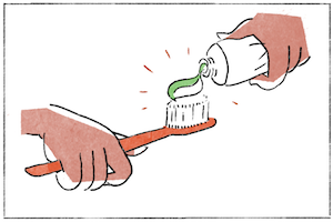 ចូលដល់រូបភាពទីនៅក្នុងរូបភាពទីយើងឃើញថា បន្ទាប់ពីនារីម្នាក់នោះ គាត់ដើរចូលក្នុងបន្ទប់ទឹកគាត់រួចរាល់ហើយ គាត់បានបើកទូកញ្ចក់ឬក៏កូនទូរបស់គាត់ ដើម្បីយកថ្នាំដុសធ្មេញនិងច្រាសដុសធ្មេញចេញមកអញ្ចឹងនៅពេលដែលភ្ញាក់ពីគេងហើយ យើងត្រូវការដុសធ្មេញ ដុសសម្អាតធ្មេញរបស់យើង ដើម្បីយកកម្ទេចកម្ទីចេញពីធ្មេញរបស់យើង ព្រោះថាពេលល្ងាច គឺយើងញ៉ាំអាហារពេលល្ងាចជាច្រើន អញ្ចឹងកម្ទេចកម្ទីនឹងនៅជាប់ធ្មេញរបស់យើងជាក់ជាពុំខានដូច្នេះនៅក្នុងរូបភាពនេះ នារីម្នាក់នោះ គាត់បានច្របាច់ថ្នាំដុសធ្មេញដាក់នៅលើច្រាសដុសធ្មេញរបស់គាត់ អញ្ចឹងថ្នាំដុសធ្មេញ ប្រអប់ថ្នាំដុសធ្មេញរបស់គាត់គឺមានពណ៌ ចំណែកឯថ្នាំដុសធ្មេញគឺមានពណ៌បៃតងនិងលាយ ហើយច្រាសដុសធ្មេញរបស់គាត់គឺមានពណ៌ក្រហមអញ្ចឹងគាត់បានច្របាច់ថ្នាំដុសធ្មេញមួយចំនួន ដាក់ទៅលើច្រាសដុសធ្មេញរបស់គាត់ បាទ គាត់ច្របាច់[ច្រាសដុសធ្មេញ]ថ្នាំដុសធ្មេញ ទៅលើច្រាសដុសធ្មេញ ដើម្បី សម្រាប់ធ្វើការដុសធ្មេញគាត់ អញ្ចឹងគាត់ដុសធ្មេញជារៀងរាល់ព្រឹកតែម្ដង ព្រោះថាការដុសធ្មេញ គឺធ្វើឲ្យយើងបំបាត់ក្លិនមាត់អញ្ចឹងពេលដែលយើងក្រោកពីគេង គឺកម្ទេចកម្ទីកាកសំណល់ ដែលយើងញ៉ាំអាហារពីពេលល្ងាចនោះនៅតោងស្អិតជាប់ធ្មេញរបស់យើង ដូច្នេះវានឹងធ្វើឲ្យមានដង្កូវស៊ីធ្មេញ ឬក៏មានក្លិនមាត់ ប្រសិនបើយើងមិនបានដុសធ្មេញនោះទេ