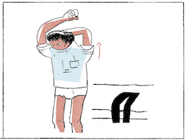 បន្ទាប់មកទៀតរូបភាពទីនៅក្នុងរូបភាពទីយើងឃើញថា បន្ទាប់ពីគាត់បើកកង្ហារហើយ ក្មេងប្រុសម្នាក់នោះ គាត់ក៏ចាប់ផ្ដើមផ្លាស់សម្លៀកបំពាក់របស់គាត់ចេញ ព្រោះពេលខ្លះ នៅពេលដែលយើងមកពីក្រៅ សម្លៀកបំពាក់ដែលយើងពាក់មកពីក្រៅ គឺធ្វើឲ្យមានការប្រឡាក់ បានន័យថានៅពេលដែលយើងដើរលេងនៅខាងក្រៅ ឬក៏ធ្វើការអាចមានដីហុយនៅតាមផ្លូវ ឬក៏អាចមានប្រឡាក់នូវធូលីតាមផ្លូវបាន ដូច្នេះយើងអត់ត្រូវពាក់ខោអាវ ដែលយើងពាក់មកពីក្រៅគេងនោះទេព្រោះវាអាចធ្វើឲ្យយើងមិនស្រួលខ្លួន ឬក៏ស្អុះស្អាប់ ឬក៏ស្កៀប ដោយសារតែមានប្រឡាក់នៅ នៅជាប់នឹងខោអាវម្យ៉ាងវិញទៀត ខោអាវដែលយើងពាក់នៅតាមផ្លូវ នៅចេញទៅក្រៅ វាអាចជាខោអាវដែលមានដៃវែង ជើងវែង ឬក៏ក្រាស់អញ្ចឹងយើងពាក់ទៅអត់ស្រួលខ្លួនទេនៅពេលដែលយើងគេងព្រោះខោអាវក្រាស់គឺយើងពាក់ទៅក្រៅដើម្បីការពារកម្ដៅថ្ងៃ អញ្ចឹងនៅពេលដែលយើងចូលដល់បន្ទប់គេង ប្រសិនបើយើងពាក់ខោអាវក្រាស់គឺវាអាចធ្វើឲ្យយើងគេងមិនស្រួល បានន័យថាគេងលក់អត់ស្រួល អញ្ចឹងយើងត្រូវផ្លាស់ខោអាវ ដែលយើងពាក់ចេញទៅក្រៅចេញ ដោយយើងផ្លាស់ជំនួសមកវិញនូវខោអាវដែលគេងយប់អញ្ចឹងជាក់ស្ដែងនៅក្នុងរូបភាពទីនេះ ក្មេងប្រុសម្នាក់នោះ គាត់ក៏បានស្រាតខោគាត់ចេញ អញ្ចឹងគាត់ស្រាតខោខ្មៅជើងវែងរបស់គាត់ចេញ ដោយយើងឃើញខោខ្មៅជើងវែងរបស់គាត់ គាត់ស្រាតហើយ គាត់ដាក់នៅលើគ្រែគេងរបស់គាត់អញ្ចឹងគាត់ស្រាតខោចេញ គាត់ស្លៀកតែខោលីអូតែប៉ុណ្ណោះអញ្ចឹងជាទូទៅ យើងស្លៀកខោជើងវែងផង យើងស្លៀកខោលីអូផង ឬក៏ខោទ្រនាប់ ឬក៏ខោក្នុង យើងអាចហៅបានបី យើងអាចហៅថាខោលីអូ យើងហៅថាខោក្នុង ឬក៏ហៅថាខោទ្រនាប់បានអញ្ចឹងយើងឃើញគាត់ស្លៀកខោលីអូពណ៌ ហើយគាត់កំពុងតែដោះអាវរបស់គាត់ចេញផងដែរ បានន័យថាគាត់កំពុងតែផ្លាស់ខោអាវអញ្ចឹងគាត់លើកដៃឡើង ហើយចាប់ទាញកអាវរបស់គាត់ឡើងឲ្យផុតពីមុខ អញ្ចឹងគាត់ដោះអាវក្រៅ ដោះអាវរបស់គាត់ចេញ ដែលគាត់ពាក់ទៅខាងក្រៅ អញ្ចឹងគាត់ដោះអាវរបស់គាត់ចេញ ដោយផ្លាស់សម្លៀកបំពាក់គេងយប់អញ្ចឹងគាត់នឹងផ្លាស់សម្លៀកបំពាក់គេងយប់ ដោយ ដោយប្ដូរពីខោអាវពាក់ទៅខាងក្រៅ មកជាសម្លៀកបំពាក់គេងយប់វិញ