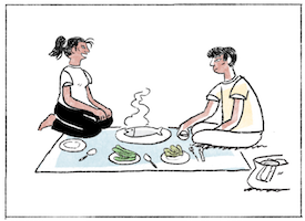បន្ទាប់មកទៀតរូបភាពទី ១៣ រូបភាពទី ១៣ បន្ទាប់ពីពួកគេរៀបចំចានម្ហូប និងចានទឹកជ្រលក់រួចរាល់ហើយ ពួកគេក៏បានអង្គុយទល់មុខគ្នា អញ្ចឹងយើងឃើញពួកគេកំពុងតែអង្គុយទល់មុខគ្នា ដោយស្ត្រីដែលជាមិត្តស្រីនោះ គាត់អង្គុយលុតជង្គង់ ឬក៏អង្គុយបត់ជើង ដោយដៃទាំងពីរគឺដាក់នៅលើភ្លៅ ចំណែកឯបុរសដែលមានវ័យ ២៣ ឆ្នាំនោះ គាត់អង្គុយពែនភ្នែន អញ្ចឹងជាធម្មតា មនុស្សស្រីគឺគាត់តែងតែអង្គុយលុតជង្គង់ឬក៏អង្គុយបត់ជើង ចំណែកឯមនុស្សប្រុស គាត់ចូលចិត្តអង្គុយពែនភ្នែន ហើយនៅចំខាងមុខរបស់ពួកគេ ឬក៏នៅកណ្ដាលពួកគេ គឺមានត្រីចំនួនមួយ ដែលកំពុងតែហុយ និងមានក្លិនឈ្ងុយ ហើយមានចានបន្លែពីរចានផងដែរដែលនៅក្បែរនោះ អញ្ចឹងពួកគេក៏ញ៉ាំត្រីជាមួយនឹងបន្លែ ផ្ទាប់ជាមួយនឹងបន្លែ ដោយយើងឃើញគាត់ទាំងពីរនាក់ គឺអង្គុយនៅលើកម្រាល ហើយមានកញ្ចប់ម្ហូបនៅក្បែរខ្លួនរបស់ពួកគេផងដែរអញ្ចឹងជាទូទៅ គឺនៅកម្ពុជា គឺយើងភាគច្រើនគឺយើងញ៉ាំបាយដោយប្រើប្រាស់កន្ទេល គឺយើងអត់ប្រើប្រាស់តុទេ អញ្ចឹងពេលខ្លះ អ្នកខ្លះ ក្រុមគ្រួសារខ្លះ គាត់ញ៉ាំបាយនៅលើតុ បានន័យថាគាត់រៀបចំតុ ហើយគាត់ដាក់បាយនៅលើតុ រួចក៏អង្គុយលើកៅអីដើម្បីញ៉ាំ ប៉ុន្តែភាគច្រើន ភាគច្រើននៅកម្ពុជា គឺយើងអត់ប្រើប្រាស់តុទេ បានន័យថាយើងអត់ប្រើប្រាស់តុទេ គឺយើងក្រាលកន្ទេល ឬក៏ការក្រាលកម្រាល អញ្ចឹងយើងក្រាលកន្ទេលនៅលើឥដ្ឋ ឬក៏នៅលើរនាបផ្ទះរបស់យើង បន្ទាប់មកយើងញ៉ាំបាយនៅលើកន្ទេល អញ្ចឹងវាជាវប្បធម៌មួយរបស់កម្ពុជា គឺយើងញ៉ាំបាយនៅលើកន្ទេល