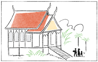 នៅក្នុងរូបភាពទីគឺជារូបភាពរបស់ព្រះវិហារមួយ អញ្ចឹងជាទូទៅនៅក្នុងពិធីបុណ្យចូលឆ្នាំខ្មែរ ប្រជាជនកម្ពុជា គាត់តែងតែទៅវត្ត បាទ ហើយនៅក្នុងវត្តគឺមានច្រើន មានដូចជាព្រះវិហារ មានដូចជាសាលាឆាន់ មានដូចជាចេតិយ ហើយនៅក្នុងរូបភាពនេះ យើងឃើញថា មានគ្រួសារមួយគ្រួសារ ដែលមានមនុស្សបីនាក់នៅក្នុងរូបភាព ដែលយើងឃើញមានមនុស្សពណ៌ខ្មៅ បាទ មនុស្សពណ៌ខ្មៅ ដែលក្នុងនោះយើងឃើញមានកូនក្មេងតូចមួយនិងមនុស្សធំពីរនាក់ បាទ មនុស្សធំពីរនាក់និងកូនក្មេងតូចមួយ ពួកគាត់ទាំងអស់គ្នានោះកំពុងតែដើរទៅកាន់ព្រះវិហារមួយអញ្ចឹងគាត់បានដើរទៅកាន់ព្រះវិហារ ដែលព្រះវិហារនោះ គឺជាព្រះវិហារដែលនៅក្នុងវត្តអញ្ចឹងវត្តដែលនៅក្នុងព្រះពុទ្ធសាសនា គឺតែងតែមានព្រះវិហារ មានសាលាឆាន់ បាទ សាលាឆាន់ គឺគេប្រើសម្រាប់ព្រះសង្ឃ ឬក៏លោកសង្ឃ គាត់ សម្រាប់ឆាន់ចង្ហាន់ បាទ អញ្ចឹងព្រះសង្ឃ ឬក៏លោកសង្ឃ គាត់ឆាន់ចង្ហាន់នៅក្នុងសាលាឆាន់ នៅពេលដែលប្រជាជន ឬក៏នៅពេលដែលប្រសក [បាសក/ឧបាសក] គាត់យកចង្ហាន់ទៅប្រគេនព្រះសង្ឃ បាទ ចំណែកព្រះវិហារ ព្រះវិហារគឺគេប្រើប្រាស់សាងសង់ឡើង សម្រាប់តម្កល់ព្រះពុទ្ធបដិមា អញ្ចឹងគេយករូបព្រះពុទ្ធ បាទ រូបព្រះពុទ្ធ ដែលជារូបចម្លាក់ថ្ម ឬក៏រូបចម្លាក់ស៊ីម៉ងត៍ នៅពេលដែលគេឆ្លាក់ជាព្រះពុទ្ធហើយ គេហៅថាព្រះពុទ្ធបដិមា អញ្ចឹងគេយករូបព្រះពុទ្ធបដិមាទៅដាក់ក្នុងព្រះវិហារ ហើយគេចូលព្រះវិហារដើម្បីថ្វាយបង្គំព្រះអញ្ចឹងជាទូទៅប្រជាជនយើងតែងតែទៅវត្ត ហើយចូលព្រះវិហារដើម្បីថ្វាយបង្គំព្រះ ម្យ៉ាងវិញទៀត នៅពេលដែលព្រះសង្ឃគាត់សូត្រធម៌ ព្រះសង្ឃដែល ដល់ម៉ោងសូត្រធម៌ពេលព្រឹកឡើង តែងតែចូលទៅសូត្រធម៌នៅក្នុងព្រះវិហារ នៅ គាត់សូត្រធម៌នៅចំពោះមុខព្រះពុទ្ធបដិមានោះផងដែរអញ្ចឹងរូបភាពនេះ យើងឃើញថាព្រះវិហារមួយ ដែលមានកម្ពស់ខ្ពស់ផុតពីដី អញ្ចឹងព្រះវិហារមានកម្ពស់ខ្ពស់ផុតពីដី ដែលនៅខាងក្រោមព្រះវិហារគឺមានសសរជាច្រើន អញ្ចឹងព្រះវិហារអាចខ្ពស់បាន គឺដោយសារមានសសរ សសរទ្រព្រះវិហារ ហើយយើងអាចឡើងទៅកាន់ព្រះវិហារនោះបាន តាមរយៈជណ្ដើរ បាទ អញ្ចឹងយើងឡើងទៅកាន់ព្រះវិហារតាមរយៈជណ្ដើរ ព្រះវិហារនោះគឺមានបង្អួចជាច្រើន បាទ មានបង្អួចជាច្រើន ដែលនៅខាងនៃជញ្ជាំង អញ្ចឹងជញ្ជាំងព្រះវិហារ គឺមានបង្អួចជាច្រើនចំណែកដំបូលព្រះវិហារគឺមានពណ៌ទឹកក្រូច បាទ ដំបូលព្រះវិហារគឺមានពណ៌ទឹកក្រូច ហើយមានពីរជាន់ អញ្ចឹងដំបូលនោះគឺមានពីរជាន់ នៅលើដំបូលគឺគេប្រើប្រាស់រចនាបថខ្មែរ បាទ រចនាបថ យើងហៅថារចនាបថ ឬក៏ក្បូរក្បាច់ ដែលយើងឃើញមានកន្ទុយនាគ បាទ រូបកន្ទុយនាគ ឬក៏ក្បាច់កន្ទុយនាគ នៅលើចុងដំបូលនីមួយៗផងដែរអញ្ចឹងនៅក្នុងរូបភាពនេះ គឺយើងនិយាយអំពីថ្ងៃចូលឆ្នាំខ្មែរ មា