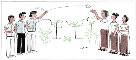 | បោះ | bɑh | 1. to throw (away), cast, fling 2. to cast (a vote) {ខ្ញុំបោះហើយ = I've voted already} 3. to scatter 4. to broadcast 5. to sow (seed) 6. to thrust (down) into, force in, insert, drive/fix (a stake in the ground) 7. to implant, set up 8. to locate, station, pitch a camp 9. to crush, grind, gin (cotton) 10. to imprint/impress (a seal), stamp, affix 11. to publish 12. to sell in large quantities with limited profit 13. to take a step |
