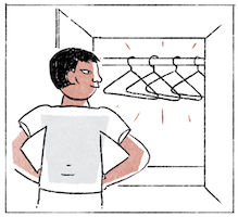 ជាក់ស្ដែងនៅក្នុងរូបភាពទីយើងឃើញមានក្មេងប្រុសម្នាក់ បាទ ក្មេងប្រុសម្នាក់ អាយុគាត់ប្រហែលជា ១៨ ឆ្នាំ ដោយក្មេងប្រុសម្នាក់ហ្នឹង គាត់មានសក់ខ្លីពណ៌ខ្មៅ គាត់ពាក់អាវដៃខ្លីពណ៌ បាទ ហើយគាត់ស្លៀកខោពណ៌ផងដែរ អញ្ចឹងក្មេងប្រុសម្នាក់ហ្នឹង កំពុងតែឈរច្រត់ចង្កេះ គាត់ឈរច្រត់ចង្កេះ ដោយភ្នែករបស់គាត់គឺសម្លឹងទៅមើលនៅក្នុងទូខោអាវរបស់គាត់ អញ្ចឹងយើងឃើញនៅពីមុខរបស់គាត់ នៅពីមុខគាត់ យើងឃើញមានទូខោអាវចំនួនមួយ បាទ ទូខោអាវចំនួនមួយ ហើយទូខោអាវនោះគឺកំពុងតែបើកទ្វារ អញ្ចឹងគាត់បើកទ្វារទូខោអាវ ដើម្បីរកមើលខោអាវនៅក្នុងទូ ប៉ុន្តែយើងឃើញថានៅក្នុងទូខោអាវនោះ គឺអត់មានខោអាវនោះទេ អញ្ចឹងទូខោអាវគឺអត់ឃើញមានខោអាវទេ គឺយើងឃើញតែមានស្មាអាវ អញ្ចឹងស្មាអាវគឺយើងប្រើសម្រាប់ព្យួរខោ ឬក៏ព្យួរអាវ ដើម្បីដាក់នៅក្នុងទូឲ្យមានសណ្ដាប់ធ្នាប់ ពេលខ្លះខោអាវគឺ នៅពេលដែលយើងដាក់នៅក្នុងទូ គឺយើងបត់ ធ្វើការបត់វា ឬក៏ធ្វើការព្យួរវា អញ្ចឹងប្រសិនបើយើងមិនមានស្មាអាវសម្រាប់ព្យួរនោះទេ យើងអាចបត់វា បាទ ក៏បានដែរ អញ្ចឹងយើងបត់វាដាក់ក្នុងទូ ទើបវាមានសណ្ដាប់ធ្នាប់និងមិនប្រឡាក់ ព្រោះថាខោអាវថ្មីប្រសិនបើយើងដាក់នៅខាងក្រៅ វាអាចនឹងហុយដីប្រឡាក់ជាក់ជាពុំខាន អញ្ចឹងយើងយកវាទៅដាក់ក្នុងទូ ហើយបិទទ្វារឲ្យជិត អញ្ចឹងវាអត់ប្រឡាក់ទេនៅពេលដែលយើងបោកហើយ នៅក្នុងរូបភាពនេះគឺ គាត់អត់មានខោអាវនៅក្នុងទូទៀតទេ ព្រោះគាត់ប្រើប្រាស់ ឬក៏គាត់ស្លៀកពាក់ខោអាវរបស់គាត់អស់មួយអាទិត្យ អញ្ចឹងគាត់អត់ទាន់បានបោក ដូច្នេះអត់មានខោអាវនៅក្នុងទូខោអាវរបស់គាត់ទេ