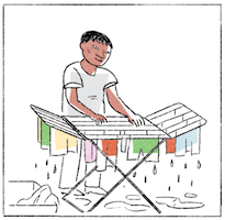 បន្ទាប់មកទៀតនៅក្នុងរូបភាពទី ១២ ចូលមកដល់រូបភាពទី ១២ យើងឃើញថា គាត់បានយកខោអាវដែលគាត់បោករួចនោះ មកហាលនៅលើស្នួទាំងអស់ អញ្ចឹងយើងឃើញស្នួនោះ គឺជាស្នួដែក បាទ ជាស្នួដែក ហើយ[បាន] គាត់បានយកខោអាវរបស់គាត់មកព្យួរពីលើស្នួនោះ ម្ដងមួយរហូតដល់តែអស់ អញ្ចឹងពេលខ្លះគឺនៅទីក្រុង ឬក៏នៅកន្លែងដែលទីប្រជុំជននានា គឺយើងប្រើប្រាស់ស្នួដែកមួយដែលយើងទិញ ដែលស្នួនោះគឺបង្កលក្ខណៈងាយស្រួល ដើម្បីឲ្យយើងហាលខោអាវ ប៉ុន្តែប្រសិនបើយើងមិនមានស្នួដែកទេ នៅក្នុងប្រទេសកម្ពុជាជាទូទៅគឺយើងចងខ្សែ អញ្ចឹងយើងអាចចងខ្សែពីរបងផ្ទះមកដល់សសរផ្ទះ ឬក៏ចងខ្សែពីរបងម្ខាងទៅរបងម្ខាងទៀត បាទ ដើម្បីចងខ្សែហើយដើម្បីហាលខោអាវនៅលើខ្សែនោះ អញ្ចឹងទោះបីជាចងខ្សែ ក៏យើងហៅថាស្នួហាលខោអាវដែរ ដូចគ្នានឹងស្នួហាលខោអាវដែកដែលយើងទិញពីផ្សារផងដែរ អញ្ចឹងជាទូទៅនៅក្នុងប្រទេសកម្ពុជា គឺយើងប្រើប្រាស់ស្នួហាលខោអាវដែលជាខ្សែ ដែលយើងចងទៅលើរបង ច្រើនជាងការហាលខោអាវទៅលើស្នួដែក