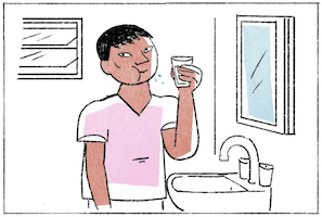 បន្ទាប់មកទៀតរូបភាពទីនៅក្នុងរូបភាពទីយើងឃើញថា បន្ទាប់ពីក្មេងប្រុសម្នាក់នោះ គាត់បានដុសធ្មេញរបស់គាត់រួចរាល់ហើយ អញ្ចឹងនៅពេលដែលគាត់ដុសធ្មេញរួចរាល់ហើយ គាត់ត្រូវខ្ពុរមាត់ចេញ ដើម្បីសម្អាតថ្នាំដុសធ្មេញចេញពីក្នុងមាត់ អញ្ចឹង ជាទូទៅ ក្រោយពេលដែលយើងដុសធ្មេញ តែងតែមានពពុះថ្នាំដុសធ្មេញនិងសារជាតិកខ្វក់ដែលនៅក្នុងធ្មេញ នៅក្នុងមាត់របស់យើង គឺវាគ្រាន់តែដុសសម្អាតចេញពីធ្មេញ គឺវាអត់ទាន់ស្អាតនោះទេ អញ្ចឹងយើងត្រូវតែប្រើប្រាស់ទឹកដើម្បីខ្ពុរមាត់ អញ្ចឹងយើងឃើញនៅក្នុងរូបភាពនេះ ក្មេងប្រុសម្នាក់នោះ គាត់អត់បានបើកទឹកដាក់ទៅក្នុងឡាបូពេញទៀតទេ ព្រោះថាការដុសធ្មេញ គឺយើងប្រើប្រាស់ទឹកតែបន្តិចតែប៉ុណ្ណោះ អញ្ចឹងអត់ដូចយើងលុបមុខ ដែលយើងប្រើប្រាស់ ត្រូវបើកទឹកដាក់ចូលក្នុងឡាបូទេ គឺគាត់ប្រើប្រាស់កូនកែវតូចមួយ អញ្ចឹងនៅក្នុងរូបភាពនេះ គឺគាត់បើកទឹកដាក់ក្នុងកូនកែវ ហើយយកកែវនោះមកកាន់ បន្ទាប់មកគាត់បានយកកែវនោះមកផឹក ដោយចាក់ទឹកចូលទៅក្នុងមាត់របស់គាត់ អញ្ចឹងគាត់ចាក់ទឹកចេញពីក្នុងកូនកែវនោះចូលទៅក្នុងមាត់របស់គាត់ បន្ទាប់មកគាត់ចាប់ផ្ដើមខ្ពុរមាត់ ដោយប្រមូលទឹកយកមកថ្គាមខាងឆ្វេង ប្រមូលទឹកយកទៅថ្គាមខាងស្ដាំ ហើយនិងក្រឡុកនៅក្នុងមាត់របស់គាត់ ដើម្បីខ្ពុរពពុះសាប៊ូចេញឲ្យអស់ អញ្ចឹងការដាក់ទឹកនៅក្នុងមាត់ ហើយលាងសម្អាតនៅក្នុងមាត់ ខ្ជាក់ទឹកចេញ យើងហៅថាខ្ពុរមាត់ អញ្ចឹងនៅក្នុងរូបភាពទីក្មេងប្រុសម្នាក់នេះ គាត់កំពុងតែខ្ពុរមាត់របស់គាត់ បន្ទាប់ពីគាត់ដុសធ្មេញរួច អញ្ចឹងគាត់ខ្ពុរមាត់ ដើម្បីប្រមូលយកកាកសំណល់ និងថ្នាំដុសធ្មេញទាំងអស់ចេញពីក្នុងមាត់របស់គាត់ ដើម្បីឲ្យមាត់របស់គាត់ស្អាត ព្រោះថាយើង ប្រសិនបើយើងលេបថ្នាំដុសធ្មេញចូលទៅក្នុងពោះ វាអាចធ្វើឲ្យយើងឈឺពោះបាន អញ្ចឹងវាអាចធ្វើឲ្យយើងឈឺ ដូច្នេះយើងអត់ត្រូវលេបថ្នាំចូលទៅក្នុងពោះនោះទេ យើងអត់ត្រូវលេបថ្នាំដុសធ្មេញចូលទៅក្នុងពោះនោះទេ គឺយើងត្រូវខ្ពុរថ្នាំដុសធ្មេញចេញពីក្នុងមាត់ឲ្យអស់