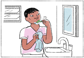បន្ទាប់មកទៀតរូបភាពទីនៅក្នុងរូបភាពទីយើងឃើញថា បន្ទាប់ពីក្មេងប្រុសម្នាក់នោះ គាត់លាបហ្វូមទៅលើមាត់របស់គាត់ ឬក៏កន្លែងណាដែលមានពុកមាត់ហើយ គាត់ក៏បានយកដងឡាម ដែលមានផ្លែឡាមនៅក្នុងនោះ យកមកកោរពុកមាត់របស់គាត់ចេញ អញ្ចឹងនៅក្នុងរូបភាពនេះ យើងឃើញថា ដៃឆ្វេងរបស់គាត់ គាត់កាន់ដងឡាមពណ៌បៃតងមួយ ដែលដងឡាមនោះគឺមានឡាមនៅក្នុងនោះផងដែរ អញ្ចឹងគាត់យកមកកោរពុកមាត់របស់គាត់ចេញ ដោយគាត់កោរកន្លែងណាដែលត្រូវបានលាបហ្វូម អញ្ចឹងគាត់កោរបណ្ដើរ គាត់ឆ្លុះមើលកញ្ចក់បណ្ដើរ ថាតើគាត់កោរស្អាតហើយឬនៅ អញ្ចឹងប្រសិនបើគាត់កោរនៅសល់ពុកមាត់បន្តិចបន្តួច គាត់ត្រូវតែកោរបន្ថែម ដើម្បីអស់ពុកមាត់ចេញពីមាត់របស់គាត់ អញ្ចឹងក្នុងការកោរពុកមាត់ យើងត្រូវតែប្រុងប្រយ័ត្នផងដែរ ដោយសារតែឡាមគឺមុត អញ្ចឹងឡាមគឺមុត ដូច្នេះប្រសិនបើយើងកោរអត់ប្រុងប្រយ័ត្នទេ យើងអាចមុតមាត់របស់យើង ឬក៏មុតថ្ពាល់របស់យើងបាន ដូច្នេះយើងត្រូវកោរដោយមានការប្រុងប្រយ័ត្នជានិច្ច ដោយយើងត្រូវឆ្លុះកញ្ចក់មើល ថាតើការកោររបស់យើងស្អាតហើយឬនៅ អញ្ចឹងប្រសិនបើកោរអត់ស្អាតទេ យើងត្រូវកោរម្ដងទៀត ប៉ុន្តែយើងត្រូវកោរដោយប្រុងប្រយ័ត្ន ដែលជាក់ស្ដែងក្មេងប្រុសម្នាក់នេះ គាត់កោរបណ្ដើរ គាត់ឆ្លុះកញ្ចក់បណ្ដើរ គាត់ប្រុងប្រយ័ត្នជាទីបំផុត ព្រោះគាត់ខ្លាចមុតថ្ពាល់របស់គាត់ ហើយយើងឃើញដៃឆ្វេងរបស់គាត់កាន់ដងឡាម ហើយដៃស្ដាំគាត់កាន់កូនកន្សែងមួយ ដើម្បីជូតចេញ អញ្ចឹងគាត់មានកូនកន្សែងដើម្បីជូតមាត់របស់គាត់នៅពេលដែលគាត់កោររួច ហើយគាត់ជូតហ្វូមចេញ ឬក៏គាត់ជូតឲ្យមាត់របស់គាត់ស្ងួតបន្ទាប់ពីកោរពុកមាត់