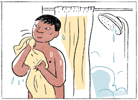 បន្ទាប់មកទៀតរូបភាពទី ១២ រូបភាពទី ១២ យើងឃើញថា បន្ទាប់ពីក្មេងប្រុសម្នាក់នោះ គាត់ងូតទឹកដុសសាប៊ូរួចរាល់អស់ហើយ គាត់ក៏បានបិទទឹក រួចក៏គាត់ដើរចេញពីកន្លែងងូតទឹក ដោយយើងឃើញកន្លែងងូតទឹករបស់គាត់ គឺមានបាំងវាំងននមួយ មានបាំងវាំងននដើម្បីកុំឲ្យខ្ទាតទឹកចេញមកខាងក្រៅ អញ្ចឹងបន្ទប់ទឹករបស់គាត់ចែកចេញជាពីរ គឺកន្លែងលាងដៃ និងកន្លែងងូតទឹក ហើយកន្លែងងូតទឹកត្រូវបាំងវាំងនន ដើម្បីកុំឲ្យមានទឹកខ្ទាតចេញមកខាងក្រៅ ដែលធ្វើឲ្យប្រឡាក់ គគ្រិច អញ្ចឹងរូបភាពនេះគឺគាត់ចេញពីកន្លែងងូតទឹក ហើយគាត់យកបានយកកន្សែងពោះគោមួយ គាត់បានយកកន្សែងពោះគោមកជូតខ្លួនរបស់គាត់ ដែលកន្សែងរបស់គាត់គឺមានពណ៌លឿង អញ្ចឹងគាត់កាន់កន្សែងរបស់គាត់ ដោយយកកន្សែងរបស់គាត់ជូតនឹង ហើយរុំនឹងខ្លួន អញ្ចឹងគាត់ជូតខ្លួនគាត់ឲ្យបានស្អាតមុននឹងគាត់ចេញពីបន្ទប់ទឹក ព្រោះថាប្រសិនបើខ្លួនគាត់អត់ទាន់ស្ងួត ហើយគាត់ដើរចូលទៅក្នុងផ្ទះ ឬក៏គាត់ចេញពីបន្ទប់ទឹកដើរចូលទៅក្នុងផ្ទះ នោះផ្ទះរបស់គាត់នឹងសើម ហើយអាចនឹងរអិល អញ្ចឹងគាត់អាចនឹងរអិលដួល ប្រសិនបើយើងសើម ខ្លួនយើងសើម ហើយជើងរបស់យើងសើម ហើយជើងជាន់ទៅលើឥដ្ឋការ៉ូ នោះវាអាចនឹងធ្វើឲ្យយើងរអិលដួល និងមានគ្រោះថ្នាក់បាន ដូច្នេះមុនពេលដែលយើងចេញពីបន្ទប់ទឹក យើងត្រូវជូតខ្លួនយើងឲ្យបានស្អាតជាមុនសិន ព្រោះប្រសិនបើមានទឹកនៅដក់ជាប់នឹងខ្លួនយើង ធ្វើឲ្យផ្ទះរបស់យើងប្រឡាក់និងសើមដោយសារទឹក ដូច្នេះមុននឹងយើងចេញពីបន្ទប់ទឹក យើងត្រូវជូតខ្លួនយើងឲ្យបានស្អាតជាមុនសិន