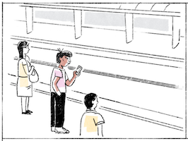 នៅក្នុងរូបភាពទីយើងឃើញថាមានបុរសម្នាក់ គាត់កំពុងតែឈរនៅក្នុងស្ថានីយរថភ្លើង បាទ បុរសនោះមានអាយុប្រហែលជា ២៥ ឆ្នាំ គាត់ពាក់អាវពណ៌ផ្កាឈូក ដៃខ្លី ហើយគាត់ស្លៀកខោជើងវែងពណ៌ខ្មៅ បុរសនោះពាក់ស្បែកជើងប៉ាតាពណ៌ ហើយដៃម្ខាងរបស់គាត់កំពុងតែច្រត់ទៅក្នុងហោប៉ៅ បាទ ដៃម្ខាងរបស់គាត់ច្រត់ទៅក្នុងហោប៉ៅ ឬក៏យើងអាចហៅម្យ៉ាងទៀតថា លូកទៅក្នុងហោប៉ៅ អញ្ចឹងដៃម្ខាងទៀតរបស់គាត់ កំពុងតែឈរចុចទូរស័ព្ទ បាទ គាត់កំពុងតែលេងទូរស័ព្ទជាមួយមិត្តភក្តិរបស់គាត់ ដូចជាគាត់កំពុងតែលេងសារ ឬក៏គាត់លេងឆាតទៅកាន់មិត្តភក្តិរបស់គាត់នៅក្នុងហ្វេសប៊ុក ឬក៏ប្រព័ន្ធបណ្ដាញសង្គមផ្សេងព្រោះថាបច្ចុប្បន្ននេះ មនុស្សយើងភាគច្រើន ជាពិសេសយុវវ័យ គាត់ចូលចិត្តលេងឆាតនិងលេងបណ្ដាញសង្គមជាមួយមិត្តភក្តិរបស់គាត់ខ្លាំងណាស់ ដូច្នេះហើយ នៅពេលដែលគាត់កំពុងតែឈរ ឬក៏មានពេលទំនេរបន្តិចបន្តួច គាត់នឹងយកទូរស័ព្ទរបស់គាត់ ដើម្បីទំនាក់ទំនងទៅមិត្តភក្តិរបស់គាត់ជាក់ជាពុំខាន អញ្ចឹងដូចយើងឃើញនៅក្នុងរូបភាពនេះ បុរសម្នាក់នោះ គាត់កំពុងតែចុចទូរស័ព្ទរបស់គាត់ ដើម្បីលេងជាមួយនឹងមិត្តភក្តិរបស់គាត់ នៅក្បែរបុរសម្នាក់នោះ យើងឃើញមានមនុស្សពីរនាក់ផ្សេងទៀត ដែលមួយនោះគឺជាមនុស្សស្រី ដែលយើងឃើញគាត់ពាក់អាវដៃខ្លីនិងស្លៀកសំពត់ ហើយមានសក់វែង មនុស្សស្រីម្នាក់នោះ គាត់កំពុងតែឈរកាន់កាបូបមួយ បាទ គាត់ឈរនៅក្បែរបុរសនោះ ដើម្បីរង់ចាំរថភ្លើងដូចគ្នា ហើយនៅចំហៀងបុរសនោះមួយទៀត គឺមានបុរសម្នាក់ផ្សេងទៀត ដែលពាក់អាវពណ៌លឿងដៃខ្លី បាទ ពួកគេកំពុងតែឈរចាំរថភ្លើងនៅក្នុងស្ថានីយរថភ្លើងមួយ អញ្ចឹងជាទូទៅនៅក្នុងប្រទេសនីមួយៗតែងតែមានស្ថានីយរថភ្លើង ក៏ប៉ុន្តែនៅក្នុងប្រទេសកម្ពុជា ស្ថានីយរថភ្លើងរបស់ប្រទេសកម្ពុជា គឺពុំទាន់ដំណើរការស្រួលបួលនៅឡើយទេ ដូច្នេះនៅប្រទេសកម្ពុជា ឬក៏ប្រទេសខ្មែរ ពុំទាន់មានស្ថានីយរថភ្លើងដែលជាទីពេញនិយមនោះទេ អញ្ចឹងប្រជាជនគាត់អត់ចូលចិត្តធ្វើដំណើរតាមរថភ្លើងនោះទេ ដោយសារតែវាពិបាក យើងពុំទាន់មានផ្លូវរថភ្លើងគ្រប់ទីកន្លែង អញ្ចឹងហើយប្រជាជនចូលចិត្តធ្វើដំណើរតាមរថយន្ត ឬក៏តាមឡាន តាមម៉ូតូជាដើម អញ្ចឹងមធ្យោបាយធ្វើដំណើរតាមរយៈរថភ្លើងនេះ គឺយើងពុំសូវធ្វើដំណើរនោះទេ ប៉ុន្តែការធ្វើដំណើរតាមរថភ្លើងពេញនិយមនៅក្នុងប្រទេសផ្សេងទៀត ដូចជាប្រទេសថៃ ប្រទេសវៀតណាម ប្រទេសម៉ាឡេស៊ីជាដើម អញ្ចឹងពួកគេមានស្ថានីយរថភ្លើង ដើម្បីសម្រាប់ឲ្យប្រជាជនរបស់គេធ្វើដំណើរ