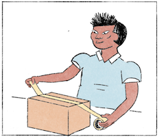 បន្ទាប់មកទៀតរូបភាពទី ១៥ នៅក្នុងរូបភាពទី ១៥ បន្ទាប់ពីគាត់សៀតណែនហើយ អីវ៉ាន់របស់គាត់សៀតណែនចូលទៅក្នុងប្រអប់នោះហើយ អញ្ចឹងគាត់ក៏បានប្រើប្រាស់ស្កុត ដើម្បីរុំឡាំងក្រដាសរបស់គាត់ឲ្យជាប់តែម្ដង អញ្ចឹងគាត់បានបិទមាត់ឡាំងក្រដាសរបស់គាត់ គាត់បានបិទ បន្ទាប់មកគាត់យកស្កុតមករុំ គាត់យកស្កុតដែលមាននៅលើតុ ដែលជារបស់ការិយាល័យប្រៃសណីយ៍ដែលទុកឲ្យប្រើនោះ អញ្ចឹងគាត់យកមកបិទនៅលើមុខតំណរបស់ឡាំងក្រដាសនោះ បានន័យថានៅពេលដែលយើងបិទគម្របឡាំងក្រដាស ឬក៏ប្រអប់តែងតែមានមុខតំណមួយ អញ្ចឹងគាត់យកស្កុតមកបិទលើមុខតំណនោះ ដើម្បីឲ្យប្រាកដថាកុំឲ្យមុខតំណនោះហើប ព្រោះនៅពេលដែលផ្ញើ នៅពេលដែលហើប អាចអីវ៉ាន់ខ្ចាយចេញពីប្រអប់ ដូច្នេះគាត់ត្រូវបិទឲ្យជិត និងឲ្យបានជាប់ល្អបំផុត ដើម្បីការពារកុំឲ្យអីវ៉ាន់របស់គាត់មានការខូចខាត ឬក៏ខ្ចាយចេញពីប្រអប់