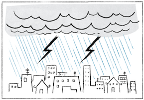 បន្ទាប់មកទៀតរូបភាពទីនៅក្នុងរូបភាពទីយើងឃើញថា បន្ទាប់ពីមានពពកពណ៌ខ្មៅគ្របនៅលើ ដណ្ដប់នៅលើទីក្រុងបានមួយសន្ទុះ យើងឃើញភ្លៀងក៏ចាប់ផ្ដើមបង្អុរ អញ្ចឹងមេឃភ្លៀងក៏ចាប់ផ្ដើមធ្លាក់ ឬក៏យើងហៅថាមេឃធ្លាក់ភ្លៀង អញ្ចឹងយើងអាចហៅបានពីរ យើងហៅថាមេឃបង្អុរភ្លៀង ឬក៏មេឃធ្លាក់ភ្លៀងដោយយើងឃើញនៅក្នុងរូបភាពនេះ គឺមេឃ ទឹកភ្លៀងកំពុងតែស្រក់ចេញពីពពក អញ្ចឹងបានន័យថាភ្លៀងស្រក់ចេញពីពពកខ្មៅ ដោយពពកខ្មៅ គឺជាពពកដែលបណ្ដុំទៅដោយទឹក បានន័យថាចំហាយទឹកគឺ[ពូត] ពូនគ្នានៅក្នុងពពកពណ៌ខ្មៅ ហើយនៅពេលដែលពពកពណ៌ខ្មៅនោះ ផ្ដុំនូវចំហាយទឹកច្រើនពេក អញ្ចឹងទឹកទាំងអស់នោះនឹងធ្ងន់ ហើយធ្លាក់ចុះមកក្រោម ដោយយើងហៅថាភ្លៀងអញ្ចឹងជាទូទៅនៅពេលដែលយើងឃើញពពកខ្មៅ គឺនឹងមានភ្លៀងធ្លាក់ ដូច្នេះយើងអត់ត្រូវរត់លេងនៅខាងក្រៅនោះទេ នៅពេលដែលយើងឃើញពពកខ្មៅ គឺយើងត្រូវចូលក្នុងផ្ទះ ហើយសាខោអាវទុកឲ្យអស់ ព្រោះថា ប្រសិនបើមេឃភ្លៀង អាចធ្វើឲ្យយើងសើម ឬក៏អាចធ្វើឲ្យយើងឈឺបានអញ្ចឹងជាក់ស្ដែងនៅក្នុងរូបភាពទីនេះ យើងឃើញពពកខ្មៅកំពុងតែបង្អុរភ្លៀងមកលើទីក្រុង ហើយមានលាយឡំនឹងរន្ទះផងដែរដែលយើងឃើញរន្ទះគឺជា ភ្លើង ភ្លើងដែលបាញ់ចេញពីពពក អញ្ចឹងនៅពេលដែលភ្លើងនោះប៉ះទៅនឹងអ្វីមួយ វាអាចធ្វើឲ្យវត្ថុនោះ ឬក៏អាចធ្វើឲ្យផ្ទះឆេះបានប្រសិនបើរន្ទះបាញ់ចំដើមឈើ គឺអាចធ្វើឲ្យដើមឈើឆេះ ហើយប្រសិនបើរន្ទះបានបាញ់ចំផ្ទះ អាចធ្វើឲ្យផ្ទះនោះឆេះ ខូចខាត តែប្រសិនបើវាបាញ់ចំមនុស្សវិញ វាអាចធ្វើឲ្យយើងមានគ្រោះថ្នាក់ដល់ជីវិត ឬក៏វាអាចធ្វើឲ្យយើងស្លាប់បានដូច្នេះ យើងអត់ត្រូវប្រើប្រាស់ទូរទស្សន៍ អត់មើលទូរទស្សន៍ ឬក៏អត់ត្រូវប្រើប្រាស់ទូរស័ព្ទទេ នៅពេលមេឃភ្លៀង ព្រោះវាអាចធ្វើឲ្យមានរន្ទះកើតឡើងបានអញ្ចឹងប្រសិនបើមានរន្ទះបាញ់ចំមនុស្ស វាអាចធ្វើឲ្យយើងស្លាប់បាន