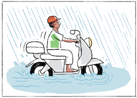 បន្ទាប់មកទៀតរូបភាពទីនៅក្នុងរូបភាពទីយើងឃើញម៉ូតូកំពុងតែជិះនៅក្នុងទឹកផងដែរ អញ្ចឹងម៉ូតូមួយគ្រឿងកំពុងតែបើកបរ ឬក៏ជិះនៅក្នុងទឹក ដោយយើងឃើញបុរសម្នាក់ គាត់ពាក់អាវពណ៌បៃតងដៃខ្លី ស្លៀកខោជើងវែងពណ៌ គាត់កំពុងតែជិះម៉ូតូពណ៌មួយនៅក្រោមភ្លៀងដោយសារតែគាត់អត់បានត្រៀមខ្លួនមុន ដូច្នេះគាត់អត់មានអាវភ្លៀងនោះទេ អញ្ចឹងគាត់អត់មានអាវភ្លៀងនោះទេ គាត់ជិះម៉ូតូ ដែលនៅក្នុងទឹក ដោយជិះកាត់ក្រោមភ្លៀង ដោយយើងឃើញគាត់ពាក់មួកសុវត្ថិភាពពណ៌ទឹកក្រូចផងដែរអញ្ចឹង ម៉ូតូរបស់គាត់ យើងឃើញនៅខាងមុខ នៅជិតដៃចង្កូតគឺមានកញ្ចក់សម្រាប់មើលក្រោយមួយអញ្ចឹងកញ្ចក់សម្រាប់មើលក្រោយ គឺជាកញ្ចក់សម្រាប់ឲ្យយើងអាចដឹងអំពីស្ថានភាពនៅខាងក្រោយម៉ូតូរបស់យើងបាន ដោយយើងអត់ចាំបាច់ងាកខាងក្រោយទេអញ្ចឹងនៅពេលដែលយើងចង់មើលផ្លូវ ឬក៏មើលអ្វីដែលនៅខាងក្រោយ យើងគ្រាន់តែក្រឡេកមើលកញ្ចក់ គឺយើងអាចមើលឃើញពុំខាន អញ្ចឹងយើងអត់ចាំបាច់ងាកក្រោយទេ ព្រោះថាប្រសិនបើយើងងាកក្រោយ ពេលខ្លះអាចធ្វើឲ្យយើងមានគ្រោះថ្នាក់បានហើយនៅខាងមុខគឺមានអំពូលភ្លើង ឬក៏ចង្កៀងភ្លើង អញ្ចឹងបុរសម្នាក់នោះគាត់ជិះម៉ូតូកាត់ភ្លៀង ដោយគាត់បើកភ្លើងផងដែរ ព្រោះដើម្បីមើលផ្លូវ ពេលខ្លះគឺពិបាកមើលផ្លូវ ប្រសិនបើយើងអត់បើកភ្លើងនោះទេ ហើយអ្នកដែលនៅខាងមុខ ក៏អត់ដឹងថាយើងកំពុងតែជិះម៉ូតូដែរ អញ្ចឹងគេអត់អាចមើលយើងឃើញ ក៏ប៉ុន្តែប្រសិនបើយើងបើកឃើញ បើយើង បើសិន បើយើងបើកភ្លើង គឺអ្នកនៅខាងមុខគេអាចមើលយើងឃើញផងដែរ ហើយនៅខាងក្រោយគឺយើងឃើញម៉ូតូរបស់គាត់ គឺមានឃ្លុបមួយ អញ្ចឹងឃ្លុបនោះ គឺជាឃ្លុបសម្រាប់ដាក់អីវ៉ាន់ អញ្ចឹងពេលខ្លះគាត់អាចដាក់សៀវភៅ ឬក៏កាតាបរបស់គាត់ ឬក៏អីវ៉ាន់របស់គាត់ផ្សេងដាក់នៅ[ឃ្លុប] នៅក្រោម នៅក្នុងឃ្លុបខាងក្រោយនោះបាន ដោយមិនចាំបាច់ចងខ្សែ ឬក៏មិនចាំបាច់កាន់នោះទេ ដោយឃ្លុបនោះគឺជាប់ទៅនឹងម៉ូតូ ដូច្នេះប្រសិនបើយើងដាក់អីវ៉ាន់ចូលទៅក្នុងឃ្លុប គឺវាអត់ជ្រុះនោះទេអញ្ចឹងម៉ូតូកំពុងតែបើកកាត់ទឹក ហើយម៉ូតូគាត់ត្រូវជិះយឺតព្រោះថាគាត់អត់អាចមើលផ្លូវឃើញ ដោយសារតែផ្លូវលិចទឹក អញ្ចឹងប្រសិនបើគាត់ជិះលឿន ប្រសិនបើផ្លូវមានក្រឡុក អញ្ចឹងអាចធ្វើឲ្យគាត់ដួលបាន ប្រសិនបើគាត់ជិះធ្លាក់ក្រឡុក អាចធ្វើឲ្យគាត់មានគ្រោះថ្នាក់ ដោយគាត់ដួលម៉ូតូជាដើម អញ្ចឹងគាត់ត្រូវជិះយឺតនិងប្រុងប្រយ័ត្នជាទីបំផុត នៅពេលដែលមានមេឃភ្លៀង