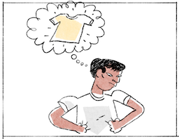 ដោយយើងឃើញនៅក្នុងរូបភាពទីនៅក្នុងរូបភាពទីយើងឃើញមានបុរសម្នាក់ ដែលគាត់មានវ័យប្រហែលជា ២០ ឆ្នាំ គាត់ពាក់អាវយឺតពណ៌ ដៃខ្លី ហើយនៅក្នុងរូបភាពនេះ យើងឃើញថាគាត់កំពុងតែសម្លឹងមើលអាវរបស់គាត់ ហើយយកដៃទាំងពីរចាប់ទាញអាវរបស់គាត់ ដោយគាត់គិតថាប្រហែលជាអាវនោះតូចពេក ឬក៏ចង្អៀតពេកសម្រាប់គាត់ ដែលឥឡូវគាត់ធំហើយ ដូច្នេះអាវចាស់ពីមុនគឺរាងចង្អៀតសម្រាប់គាត់ ដោយគាត់ពាក់ទៅមិនសូវស្រួលខ្លួន ឬក៏គាត់ពាក់ទៅគឺមើលឃើញខើច ដោយសារតែអាវនោះវាតូចពេក អញ្ចឹងនៅក្នុងរូបភាពនេះ គឺយើងឃើញគាត់កំពុងតែគិតទៅដល់អាវថ្មីមួយ អញ្ចឹងគាត់គិតទៅដល់អាវមួយ ដែលជាអាវយឺតដែរ ប៉ុន្តែពណ៌លឿង អញ្ចឹងគាត់ចង់បានអាវយឺតថ្មីមួយសម្រាប់ពាក់ ដោយសារតែអាវយឺតដែលគាត់កំពុងតែពាក់ គឺវាតូចពេក ឬក៏ចង្អៀតខ្លួនគាត់ពេក អញ្ចឹងគាត់គិតចង់ទិញអាវយឺតពណ៌លឿងដៃខ្លីមួយសម្រាប់ពាក់នៅពេលថ្ងៃក្រោយទៀត ដូច្នេះហើយគាត់ក៏សម្លឹងមើលអាវរបស់គាត់យ៉ាងយកចិត្តទុកដាក់ អញ្ចឹងគាត់នឹងទៅទិញអាវថ្មីមួយទៀត