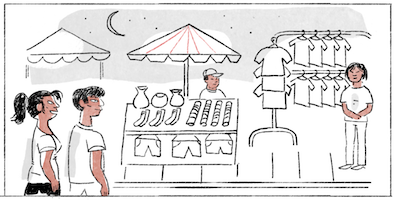 បន្ទាប់មកទៀតរូបភាពទីនៅក្នុងរូបភាពទីយើងឃើញថា ពួកគេ បន្ទាប់ពីពិភាក្សាគ្នាហើយ អញ្ចឹងជួនជាថ្ងៃនោះជាថ្ងៃសម្រាកផង ឬក៏ជាពេលល្ងាច ឬក៏ពេលយប់ដែលពួកគេចេញពីធ្វើការ អញ្ចឹងពួកគេអត់ធ្វើការទៀតទេ ដូច្នេះពួកគេក៏បានដើរមកផ្សារដើម្បីទិញខោអាវ ដើម្បីរកមើលអាវយឺតថ្មីសម្រាប់បុរសម្នាក់នោះអញ្ចឹងយើងឃើញនៅក្នុងរូបភាពនេះ ពួកគេក៏បានដើរមកដល់ផ្សាររាត្រីមួយ ដែលជាទូទៅផ្សាររាត្រីគឺជាផ្សារមួយ ដែលយើងបើកនៅពេលយប់តែប៉ុណ្ណោះ អញ្ចឹងពេលថ្ងៃគឺផ្សាររាត្រីអត់បើកទេ ដែលផ្សាររាត្រី គឺបើកតែពេលយប់ អញ្ចឹងអាចបើកចាប់ពីម៉ោងល្ងាច រហូតដល់ម៉ោង ១១ យប់ ឬក៏ម៉ោង ១២ យប់អញ្ចឹងនៅក្នុងផ្សាររាត្រីគឺយើងលក់ដូចផ្សារពេលថ្ងៃដែរអញ្ចឹងមានផ្សារខ្លះគេបើកពេលថ្ងៃ ផ្សារខ្លះគេបើកពេលយប់ អញ្ចឹងផ្សារពេលយប់យើងហៅថាផ្សាររាត្រី ដោយសារតែពេលយប់យើងអាចហៅម្យ៉ាងទៀតបានថារាត្រី ពេលរាត្រីអញ្ចឹងពេលរាត្រី គឺ ឬក៏ពេលយប់ហ្នឹងគឺអត់មានព្រះអាទិត្យទេ គឺមានតែព្រះចន្ទដែលជាក់ស្ដែងយើងឃើញនៅក្នុងរូបភាពនេះគឺមានព្រះចន្ទមួយដែលកំពុងតែរះ ហើយពួកគេទាំងពីរនាក់ក៏បានដើរមកដល់ផ្សាររាត្រីនោះ ដោយយើងឃើញមានតូបជាច្រើនកំពុងតែលក់ដូរ ដែលយើងឃើញមាន តូបនោះគឺមានស្តង់ផងដែរ យើងហៅថាស្តង់ ដែលជារោងមួយសម្រាប់ដាក់អីវ៉ាន់លក់ដូរដែលយើងឃើញនៅខាងមុខពួកគេទាំងពីរនាក់ គឺមានបុរសម្នាក់ គាត់ឈរនៅក្រោមឆត្រមួយ នៅខាងមុខ នៅខាងក្រោយកន្លែងលក់ដូររបស់គាត់ ដែលតូបនោះអាចលក់ជាស្រោមជើង ឬក៏អាចលក់ជាឆ្នាំងដី ឬក៏ក្អមជាដើម ដែលយើងឃើញគាត់មានព្យួរខោផងដែរអញ្ចឹងបានន័យថាគាត់ក៏មានលក់ខោអាវផង គាត់លក់ជាស្រោមជើងផង ឬក៏លក់ជាឆ្នាំងផងដែរដែលនៅក្នុងផ្សាររាត្រីគឺលក់ច្រើនប្រភេទ មានទំនិញច្រើនប្រភេទដើម្បីលក់ អញ្ចឹងពេលខ្លះ ពេលយើងត្រូវការទិញទំនិញ នៅពេលដែលយើងចេញពីធ្វើការពេលល្ងាច អញ្ចឹងផ្សារខ្លះគេបិទអស់ហើយ ដូច្នេះយើងអាចទៅរកទំនិញនៅផ្សាររាត្រីបាន យើងអាចទិញទំនិញនៅផ្សាររាត្រីបានតាមតម្រូវការអញ្ចឹងក្បែរតូបរបស់បុរសម្នាក់នោះ ដែលបុរសដែលពាក់មួកនោះ គឺយើងឃើញមានកន្លែងមួយទៀតដែលគេលក់ខោអាវដែលយើងឃើញនៅទីនោះគឺមានគេព្យួរអាវលក់ជាច្រើន អញ្ចឹងគេមានព្យួរអាវលក់ ដោយអាវគេព្យួរទៅនឹងស្មាអាវ ឬក៏ទំពក់ព្យួរខោអាវយើងហៅថាទំពក់ព្យួរខោអាវ ឬក៏ស្មាអាវក៏បានដែរអញ្ចឹងគេប្រើដែកសម្រាប់ព្យួរអាវដាក់ទៅលើរបារដែកមួយ អញ្ចឹងរបារដែកនោះ យើងឃើញមានពីរជាន់ ដែលជាន់ទីមួយព្យួរអាវ ក៏ព្យួរអាវ ជាន់ទីពីរក៏ព្យួរអាវផងដែរ ហើយនៅជិតរបារដែកនោះគឺមានអ្នកលក់ម្នាក់ផងដែរ ដែលជាអ្នកលក់ស្រីអញ្ចឹងអ្នកលក់ហ្នឹងគឺគាត់ពាក់អាវ ខោជើងវែង ហើយគាត់ឈរជិតខោអាវរបស់គាត់ដែលកំពុងតែលក់ អញ្ចឹងបានន័យថ