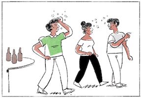 បន្ទាប់មកទៀតនៅក្នុងរូបភាពទីនៅក្នុងរូបភាពទីយើងឃើញថា បន្ទាប់ពីពួកគេបានបង់លុយថ្លៃស្រា ឬក៏ថ្លៃម្ហូបរួចរាល់ហើយ ពួកគេក៏បានដើរត្រលប់ទៅផ្ទះ អញ្ចឹងយើងឃើញនៅក្នុងរូបភាពនេះ គឺពួកគេរៀងស្រវឹងបន្តិច ដោយសារតែគេញ៉ាំស្រាម្នាក់មួយដប អញ្ចឹងបានធ្វើឲ្យពួកគេរៀងស្រវឹង អញ្ចឹងអាការៈស្រវឹងគឺយើងមានអារម្មណ៍ថាវិលមុខ ឬក៏ឈឺក្បាលបន្តិចបន្តួច ហើយពេលខ្លះប្រសិនបើយើងញ៉ាំស្រាបៀរច្រើន ឬក៏ញ៉ាំស្រាច្រើន វាបណ្ដាលឲ្យយើងក្អួតផងដែរ ព្រោះថានៅពេលដែលជាតិអាល់កុលនៅក្នុងខ្លួនយើងច្រើន វានឹងបណ្ដាលឲ្យយើងក្អួត ឬក៏ឲ្យយើងឈឺក្បាល ដូច្នេះហើយយើងមិនត្រូវញ៉ាំស្រាបៀរ ឬក៏ស្រាច្រើននោះទេ ជាក់ស្ដែងនៅក្នុងរូបភាពទីនេះ អ្នកទាំងបីគឺញ៉ាំស្រាតែម្នាក់មួយដបតែប៉ុណ្ណោះ ក៏ប៉ុន្តែវាបានធ្វើឲ្យគេស្រវឹងបន្តិច ដែលធ្វើឲ្យពួកគេពិបាកក្នុងការដើរ ហើយពួកគេមានអាការៈវិលមុខនិងឈឺក្បាល យើងឃើញនៅក្នុងរូបភាពនេះ គឺបុរសដែលពាក់អាវពណ៌បៃតងដៃខ្លី គាត់បានយកដៃម្ខាងរបស់គាត់ទៅច្រត់ក្បាល បានន័យថាគាត់កំពុងតែវិលមុខ អញ្ចឹងគាត់មានអាការៈស្រវឹង ពិបាកដើរ ដោយគាត់វិលមុខ ហើយនារីនិងបុរសម្នាក់ទៀត គាត់កំពុងតែដើរបណ្ដើរ និយាយគ្នាបណ្ដើរ ដោយគាត់និយាយគ្នាលេង ឬក៏គាត់និយាយគ្នាអំពីការងារ ឬក៏ការសិក្សាផ្សេងអញ្ចឹងបានន័យថាពួកគេបានញ៉ាំស្រាម្នាក់មួយដបហើយ បន្ទាប់មកពួកគេត្រលប់ទៅផ្ទះ ដោយមានអាការៈស្រវឹងបន្តិចបន្តួច ប៉ុន្តែពួកគេមិនស្រវឹងខ្លាំងនោះទេ ដោយពួកគេអាចទប់ស្មារតីរបស់ពួកគេបាន